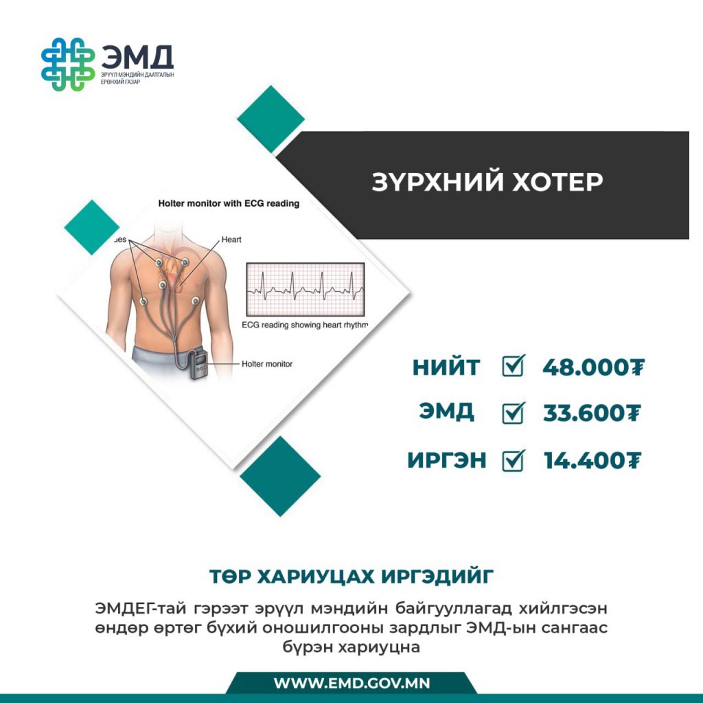 Артерийн даралт 24 цагийн хяналт, зүрхний холтер бичлэгийн шинжилгээний 70 хувийг эрүүл мэндийн даатгалын сангаас хөнгөлнө.