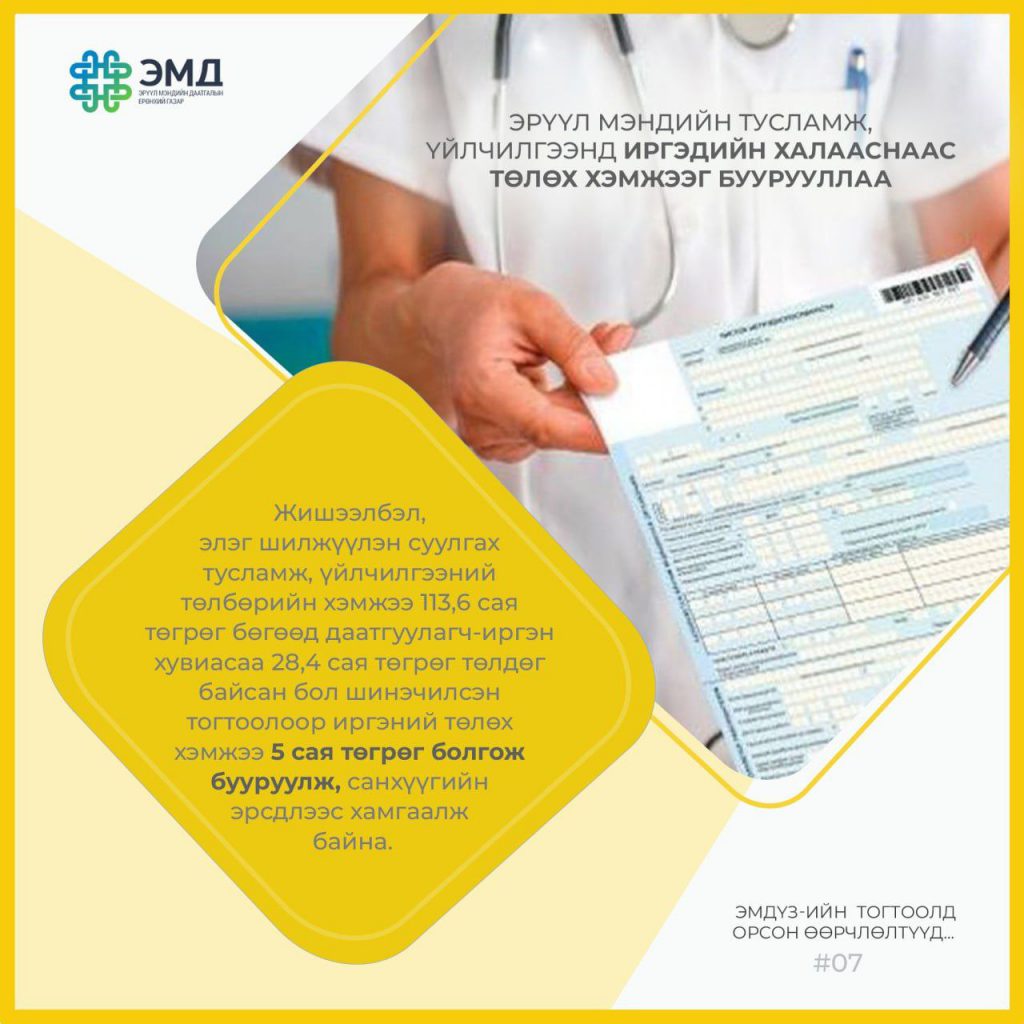 Иймд тогтмол дүнгээр төлөх хэлбэрт шилжүүллээ. Ингэснээр өндөр өртөгтэй тусламж, үйлчилгээнд төлөх иргэдийн төлөх төлбөрийн хэмжээг бууруулав. Тухайлбал, элэг шилжүүлэн суулгах тусламж, үйлчилгээний төлбөрийн хэмжээ 113,6 сая төгрөг бөгөөд иргэн, даатгуулагч хувиасаа 28,4 сая төгрөг төлдөг байсан бол шинэчилсэн тогтоолоор иргэний төлөх хэмжээ 5 сая төгрөг болгож бууруулж, санхүүгийн эрсдлээс хамгаалж байна.