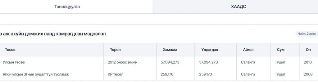 Үүний 57 сая 94 мянган төгрөгийг нь 2012 онд улсын төсвөөс, 259,170 төгрөг нь Япон улсын ЗГ-ын буцалтгүй тусламжаар авч байсан аж. Өдгөө энэ зээлээ төлөөгүй байгаа тухай shilen.gov.mn сайт дээр ил болж байв.