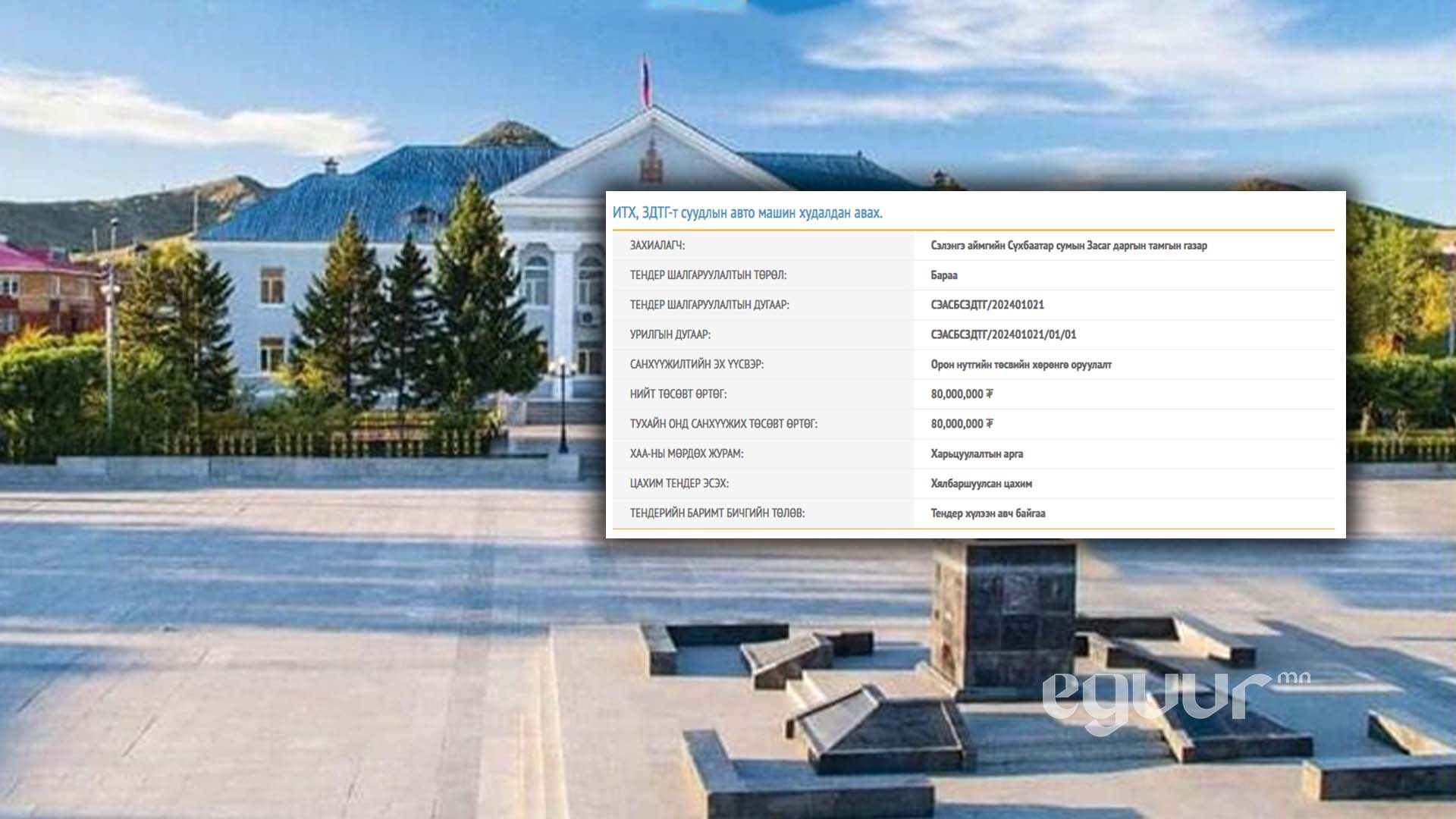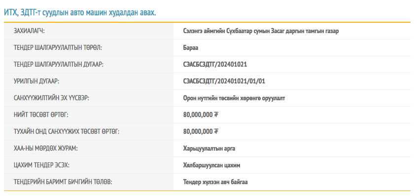 Сэлэнгэ аймгийн Сүхбаатар сумын Засаг даргын тамгын газар орон нутгийн төсвийн хөрөнгө оруулалтын 80 сая төгрөгөөр суудлын автомашин худалдаж авах тендер зарлажээ.
