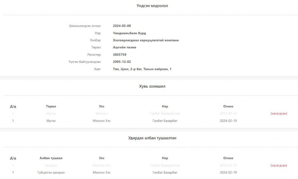 "Чандманьбаян бүрд" ХХК-ийн талаарх мэдээллийг "Opendata" сайтаас хайж үзвэл 2013 болон 2024 онд эзэмшигчийн бүртгэлээ өөрчилж байжээ. Тодруулбал, Цээл сумын засаг дарга асан М.Ганбат өөрийн хүүхдүүдийнхээ нэр дээр тус компанийг шилжүүлсэн байна.