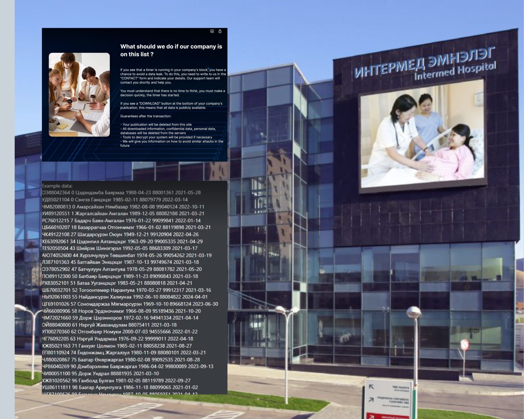 Интермед эмнэлгийн өвчтөнүүдийн мэдээллийг Москвад төвтэй "SpaceBears" бүлгэм хакердаж, 280 мянган хүний хувийн мэдээлэл, утасны дугаар, эмнэлгийн дата зэргийг хулгайлаад буй. Тус бүлгэмийн үйл ажиллагаа нь дата барьцаалж, мөнгө шаардахад чиглэдэг.