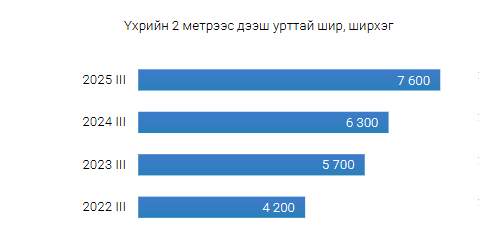 ҮСХ-ны хамгийн сүүлийн мэдээллээр үхрийн хоёр метрээс дээш урттай шир 2025 оны гуравдугаар сард 7.6 мянган төгрөг болж, өмнөх оны мөн үеэс 1.3 мянган төгрөгөөр өссөн гэв. Харин хонь болон бусад малын арьс ширний үнийн статистик байхгүй байна.