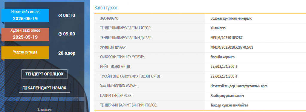 Уг тендерийг гурав хоногийн өмнө буюу дөрөвдүгээр сарын 21-ний өдөр зарлагдсан бөгөөд материалыг ирэх тавдугаар сарын 19-ний өдрийг дуустал хүлээн авна. Ингэхдээ тендерт тусгагдсан нийт өртгийг "Эрдэнэс критикал минералс" ТӨҮГ өөрийн хөрөнгөөсөө энд онд санхүүжүүлнэ хэмээжээ.