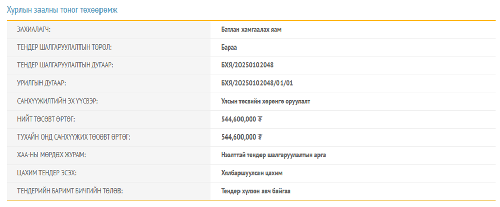 Тендерт тусгагдсан нийт өртгийг улсын төсвийн хөрөнгө оруулалтаас гаргах бөгөөд энэ ондоо санхүүжүүлнэ. Харин тендер хүлээн авах эцсийн хугацаа нь 2025 оны дөрөвдүгээр сарын 29-ний өдөр аж.