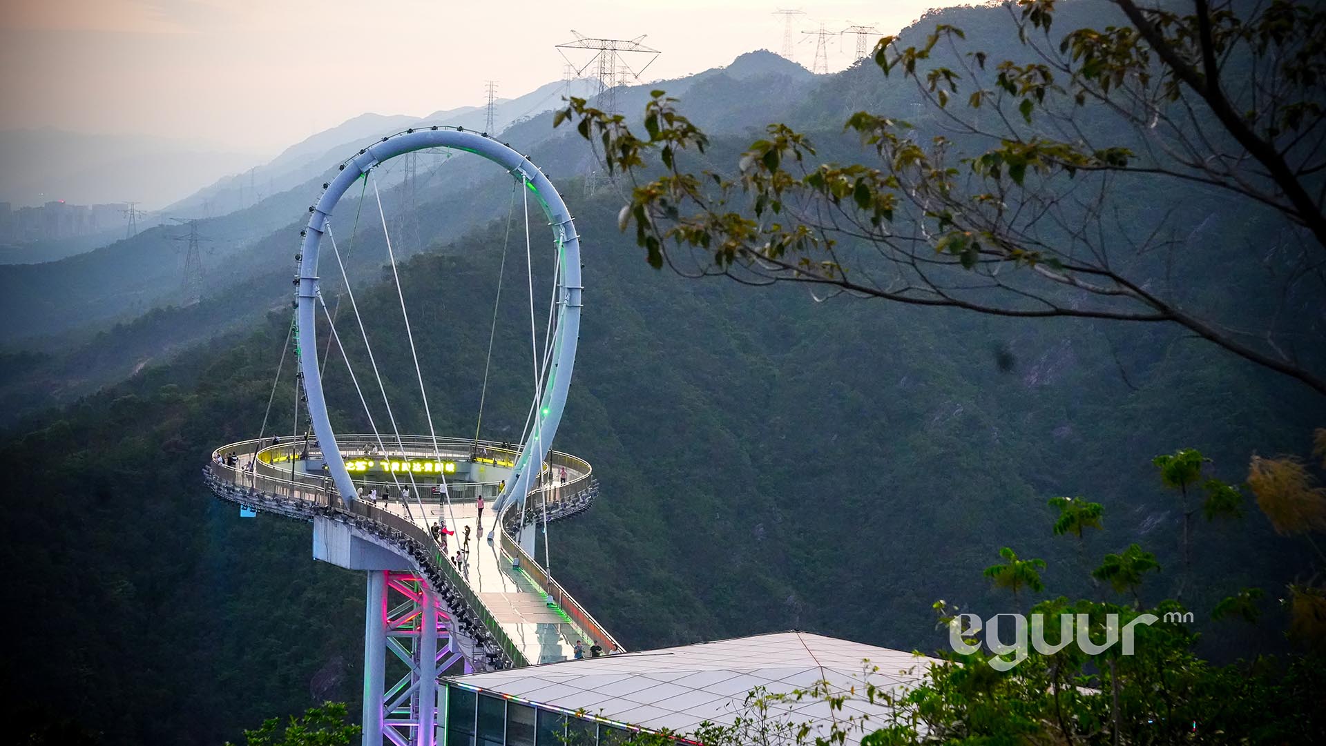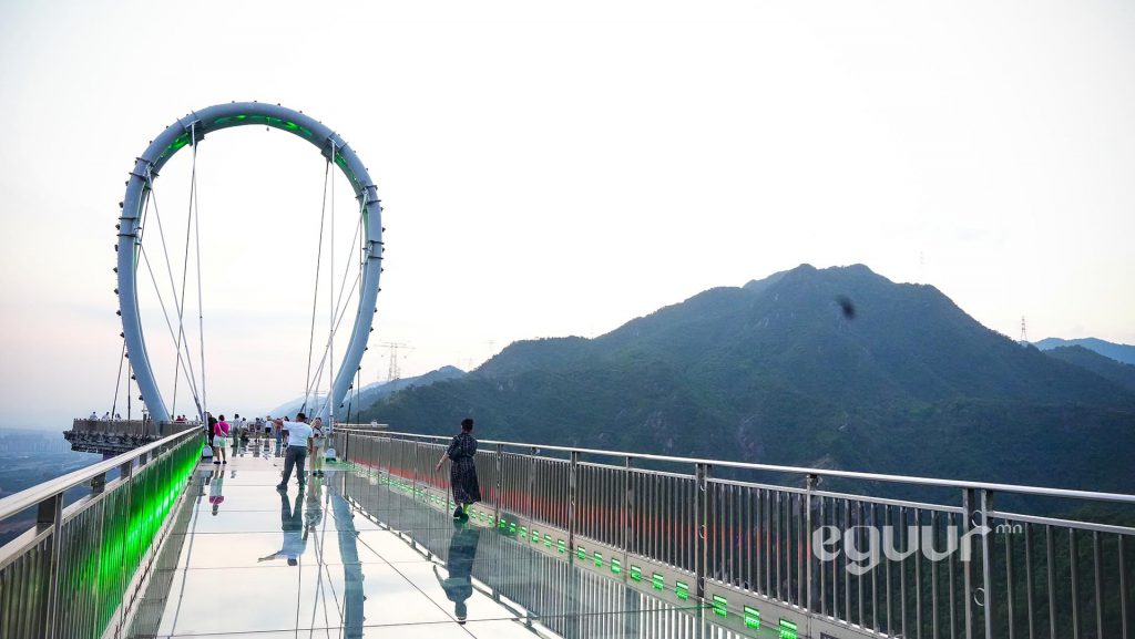 Хятадын Гуанжоу хотоос 1.5 цагийн зайд орших Цинюань хотын Хуангтэншиа аялал жуулчлалын бүс нь жуулчдын зорин очдог газар гэдгээрээ онцлог бөгөөд үлэмж том шилэн гүүр нь уулын хадан дээр байрладаг байна. Хэлбэр хийцийн хувьд аварга том теннисний хоёр цохиурыг зөрүүлэн байрлуулсан мэт харагддаг учир “Circular Glass Bridge – “Big Rackets” хэмээн нэрлэжээ.