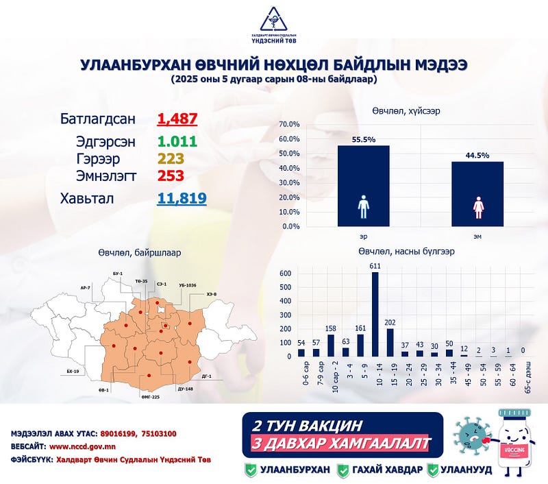 Өнөөдөр буюу 2025 оны тавдугаар сарын 8-ны байдлаар нийт улаанбурхан өвчний лабораториор батлагдсан 1487, эмнэлэгт хэвтэн эмчлүүлж байгаа 253, гэрээр 223, эдгэрсэн 1011, Хавьтал 11819 байгаа аж.