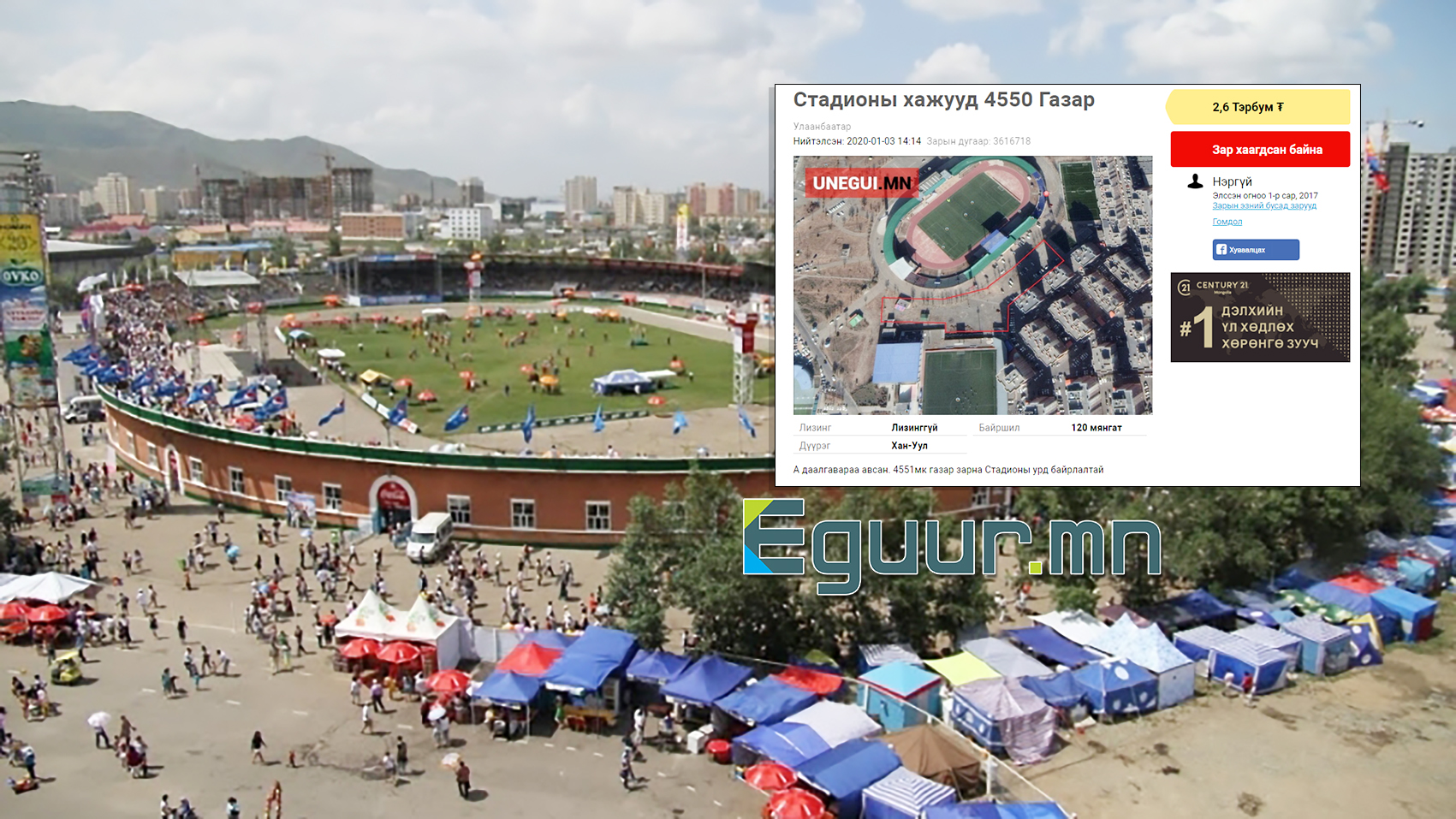 Нэгдүгээр сарын 03-ны өдөр онлайн худалдааны UNEGUI.MN сайтад, Төв цэнгэлдэх хүрээлэн орчмын 4550 метр.кв газрыг 2.6 тэрбум төгрөгөөр худалдах тухай зар байршсан билээ. Үүнд, “Монголын хөл бөмбөгийн холбоо”-ны ногоон талбай, “Хурд” хороолол болон Төв цэнгэлдэх хүрээлэнгээр хашигдсан хэсэг газрыг онцолж, газрын зураг дээр тодруулсан байв. Мөн “А” даалгавраа биелүүлсэн буюу барилга барих зөвшөөрөлтэй гэж дурьдсан.