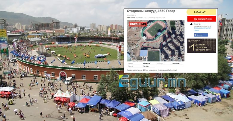 Нэгдүгээр сарын 03-ны өдөр онлайн худалдааны UNEGUI.MN сайтад, Төв цэнгэлдэх хүрээлэн орчмын 4550 метр.кв газрыг 2.6 тэрбум төгрөгөөр худалдах тухай зар байршсан билээ. Үүнд, “Монголын хөл бөмбөгийн холбоо”-ны ногоон талбай, “Хурд” хороолол болон Төв цэнгэлдэх хүрээлэнгээр хашигдсан хэсэг газрыг онцолж, газрын зураг дээр тодруулсан байв. Мөн “А” даалгавраа биелүүлсэн буюу барилга барих зөвшөөрөлтэй гэж дурьдсан.