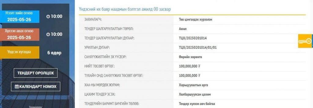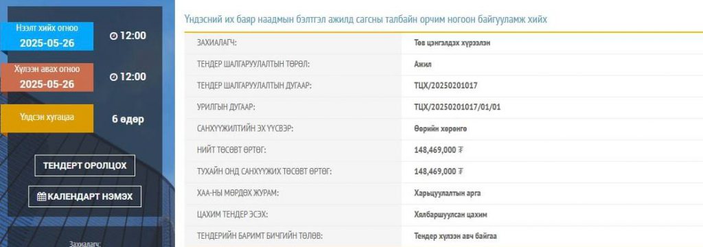 Уг гурван тендерийн материалыг хүлээн авах хугацаа 2025 оны тавдугаар сарын 26-ний өдрийг хүртэл үргэлжилнэ.