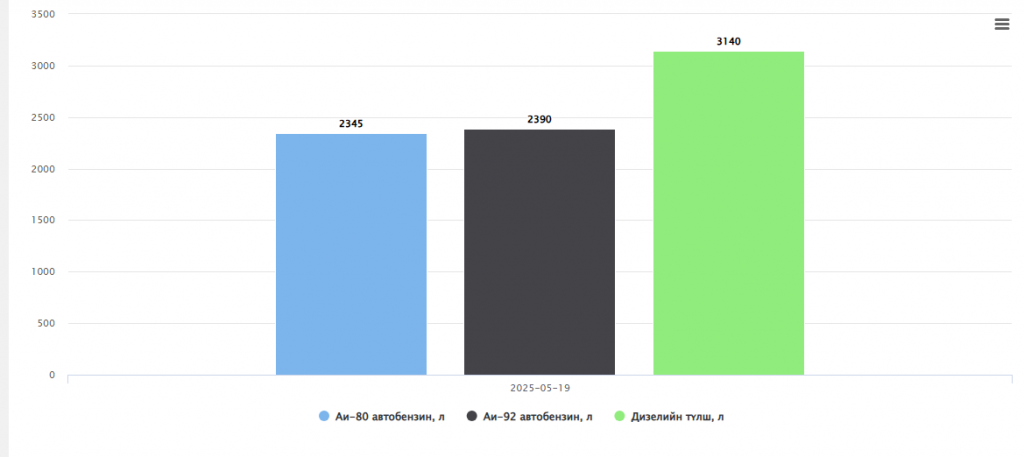 Статистикийн мэдээллийн нэгдсэн сангийн 2025 оны тавдугаар сарын 19-ний өдрийн судалгаагаар АИ-80, АИ-92, дизелийн түлшний үнэ 2345-3140 төгрөг байжээ.