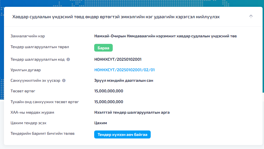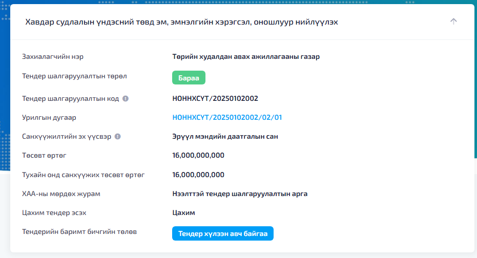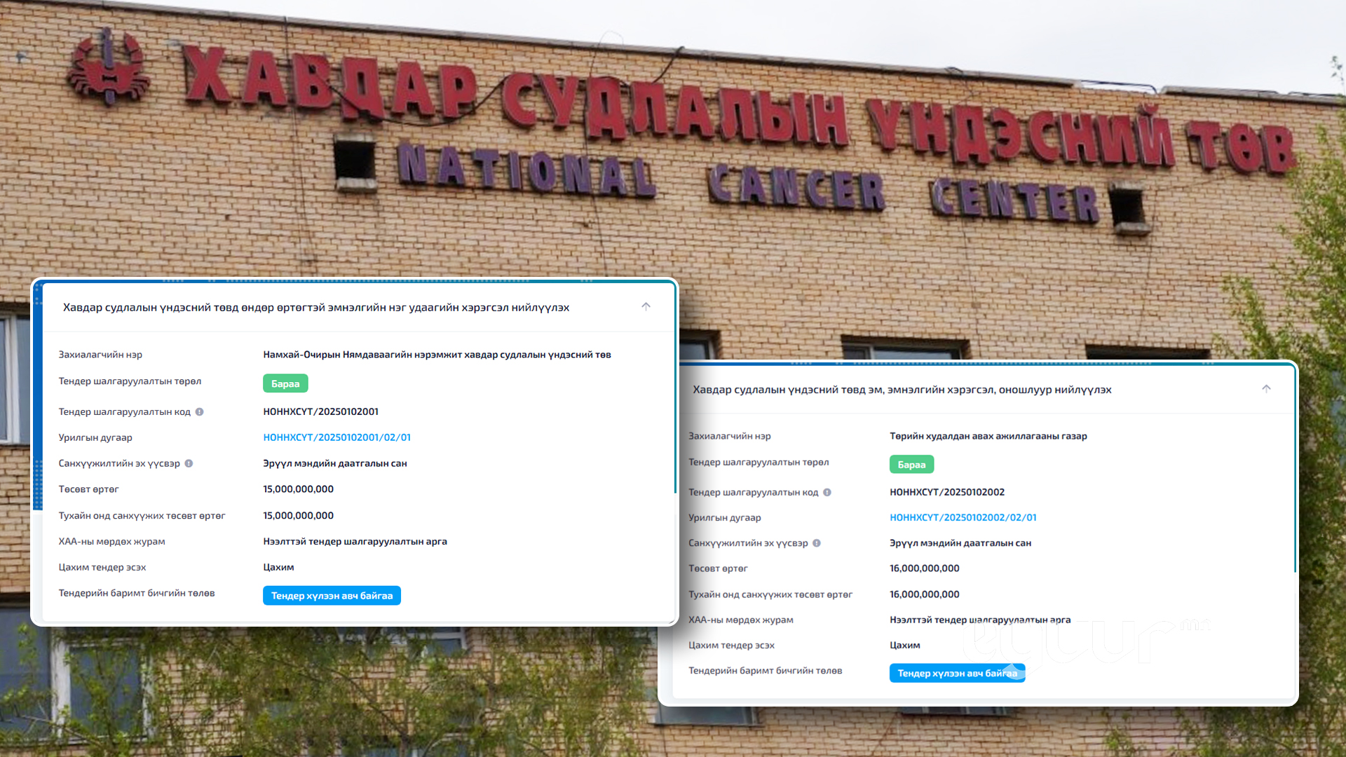 Тодруулбал, Хавдар судлалын үндэсний төвд 16 тэрбум төгрөгөөр эм, эмнэлгийн хэрэгсэл, оношлуур авах, 15 тэрбум төгрөгөөр өндөр өртөгтэй эмнэлгийн нэг удаагийн хэрэгсэл авах тендерийг тус тус зарлажээ.