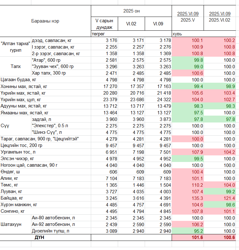 Улаанбаатар хотод 2025 оны зургаадугаар сарын 09-ний байдлаар гол нэрийн барааны үнэ өмнөх сараас 1.6 хувиар, харин өмнөх долоо хоногоос 0.6 хувиар өссөн үзүүлэлттэй байгаа тухай Үндэсний статистикийн хорооноос мэдээллээ. Өмнөх долоо хоногоос өргөн хэрэглээний найман нэр төрлийн барааны үнэ өссөн байна. Тодруулбал