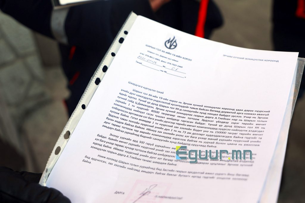 Шарын гол ХК-д санхүүгийн хүнд нөхцөл байдал үүсээд байна. Учир нь Эрчим хүчний сайд Ц.Даваасүрэн, Эрчим хүчний зохицуулах хорооны дарга А.Тлейхан нар Шарын голын уурхайн нэг тонн нүүрсийг 40.500 төгрөгөөр хянан тогтоож, “Эрдэнэт” үйлдвэр гэх мэт төрийн өмчит компаниудад нийлүүл гэсэн тушаал шийдвэр гаргасан байдаг. Үүний үр дүнд Шарын гол ХК  олборлосон өртгөөсөө хэд дахин  бага үнийн дүнгээр төрийн өмчит компаниудад нүүрсээ нийлүүлж, алдагдал хүлээж байна. Гэтэл өнөөдөр нэг тонн нүүрсний зах зээлийн бодит үнэ 150 мянган төгрөг байна. Төрийн өмчид Эрдэнэс тавантолгой ХК нэг тонныг 75 мянган ам доллараар худалдаалж байгаа гэдгийг та бүхэн мэдэж байгаа. Ийнхүү зах зээлийн үнээс хэд дахин бага үнээр манай уурхайн нүүрсний үнийг тогтоож байгаа нь цаана ажиллаж амьдарч байгаа уурхайчид биднийг санхүүгийн хүнд байдалд оруулаад байна. Уг уурхайн цаана 500 гаруй уурхайчин, сумын 8000 гаруй иргэдийн амьдрал өрнөж байдаг. Иймээс нүүрсний үнийг хэт багаар тогтоосон шийдвэрээ цуцлахыг Эрчим хүчний зохицуулах газрын дарга А.Тлейхан танаас шаардаж байна. Мөн тэд алдагдал хүлээснээс үүдэж цалингаа тавихад хэцүү болж, цалингаа нэмж чадахгүй маш удаан хугацаанд явж байна" гэлээ.