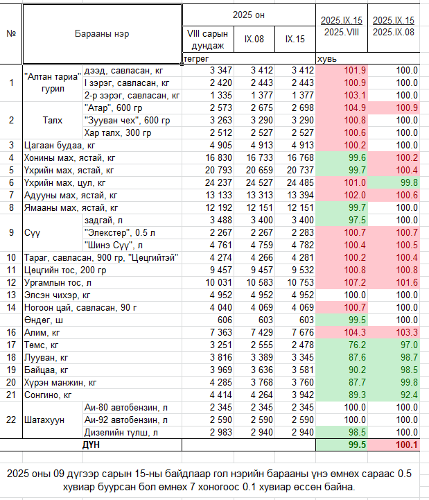 Харин төмс кг тутамдаа 77 төгрөгөөр буурч 2478, байцаа кг тутамдаа 55 төгрөгөөр буурч 3581, сонгино кг тутамдаа 322 төгрөгөөр буурч 3942, лууван кг тутамдаа 44 төгрөгөөр буурч 3345, үхрийн цул мах кг тутамдаа 42 төгрөгөөр буурч 24,485 төгрөг болсон байна.