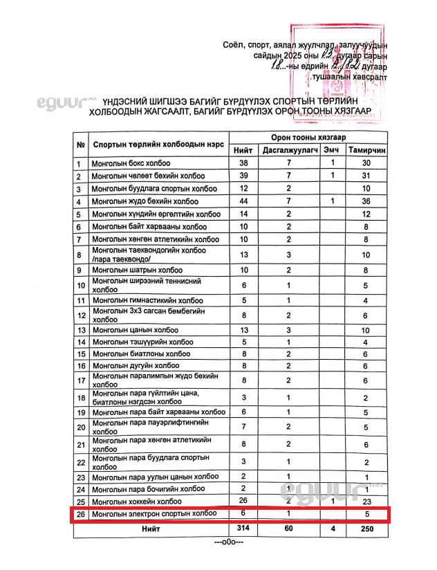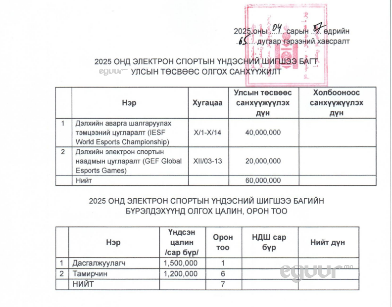 Ингээд, IESF тэмцээнд 40 сая, GEF тэмцээнд 20 сая төгрөгийн дэмжлэг олгохоор баталж.