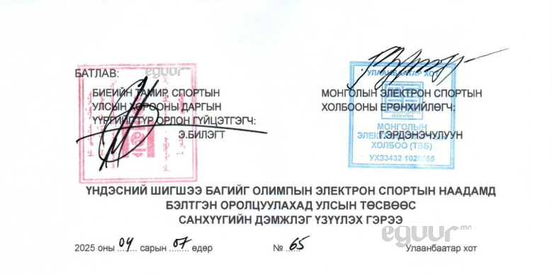 Түүнчлэн Биеийн тамир, спортын хорооны 2025 оны дөрөвдүгээр сарын тушаалаар энэ “Монголын электрон спортын холбоо” гэдэгт төсвийн дэмжлэг үзүүлэхээр гэрээлжээ. Энэ гэрээ “Үндэсний шигшээ багийг олимпын электрон спортын наадамд бэлтгэн оролцуулахад улсын төсвөөс санхүүгийн дэмжлэг үзүүлэх” нэртэй.