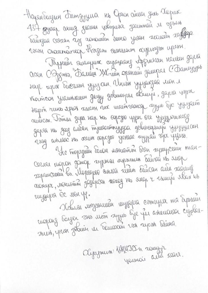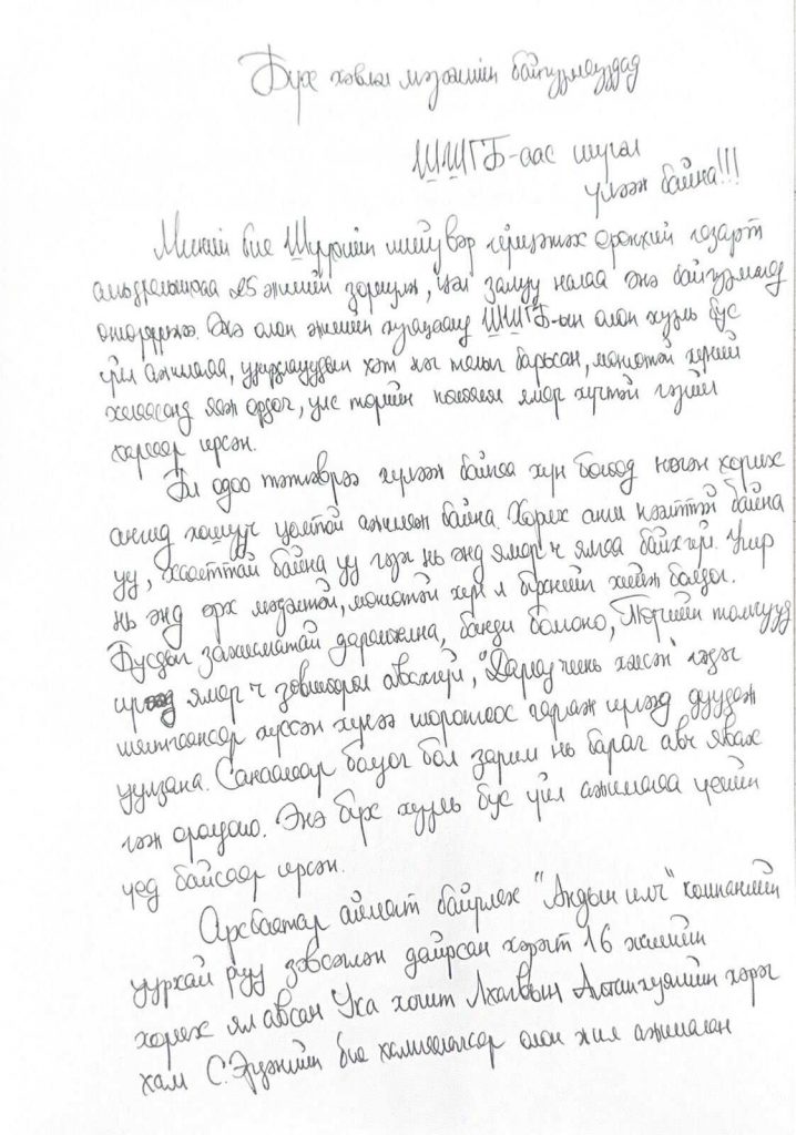 Захидалд, "Миний бие Шүүхийн шийдвэр гүйцэтгэх ерөнхий газарт амьдралынхаа 25 жилийг зориулж, цэл залуу насаа энэ байгууллагад өнгөрүүлжээ. Энэ олон жилийн хугацаанд Шүүхийн шийдвэр гүйцэтгэх байгууллагын олон хууль бус үйл ажиллагаа, удирдлагуудын хэт нэг талыг барьсан, мөнгөтэй хүний халаасанд яаж ордог, улс төрийн нөлөөлөл ямар хүчтэй гэдгийг харсаар ирсэн. Би одоо тэтгэврээ хүлээж байгаа хүн бөгөөд нэгэн хорих ангид хошууч цолтой ажиллаж байна. Хорих анги нээлттэй байна уу, хаалттай байна уу гэдэг нь энд ямар ч ялгаа байхгүй. Учир нь энд эрх мэдэлтэй, мөнгөтэй хүн л бүхнийг хийж болдог. Бусдыг захиалгатай дарамтална, банди болгоно, Төрийн томчууд ирээд ямар ч зөвшөөрөл авахгүй, “Даргад чинь хэлсэн” гэдэг шалтгаанаар хүссэн хүнээ шоронгоос гаргаж ирээд дуудаж уулзана. Санаагаар болдог бол зарим нь бараг авч явах гэж оролдоно. Энэ бүх хууль бус үйл ажиллагаа үеийн үед байсаар ирсэн. Сүхбаатар аймагт байрлах “Андын илч” компанийн уурхай руу зэвсэглэн дайрсан хэрэгт 16 жилийн хорих ял авсан Ука хочит Лхагвын Алтанхуягийн хэрэг хам С.Эрдэнийн бие хамгаалагчаар олон жил ажилласан Наранболдын Батдуулга нь Орхон аймаг дахь Хорих 437 дугаар ангид заалны цэвэрлэгч заалттай ял эдэлж байхдаа саяхан хэд хоногийн өмнө улаан хоолойн хавдар гэсэн оноштойгоор Нэгдсэн эмнэлэгт хүргэгдэн ирсэн. Түүнийг эмчлүүлэх хугацаанд Ардчилсан намын дарга асан С.Эрдэнэ, “Бамаш” ХХК-ийн ерөнхий захирал С.Батсуурь нар ирж биечлэн уулзсан. Ингэж уулзахдаа мөн л тогтсон уламжлалын дагуу зөвшөөрөл авалгүй, дарга цэрэг нарт чинь ярьж хэлсэн гэх шалтгаанаар хууль бус уулзалт хийсэн. Гэтэл дарга нар нь өөрсдөө үүрэг өгч уулзуулчхаад дараа нь доод албан тушаалтнуудаа зөвшөөрөлгүй уулзуулсан гээд ажлаас нь халж өөрсдөө уснаас хуурай гарч үлдлээ. Улс төрчдийн болон мөнгөтэй баян хүмүүсийн тансаглал шорон дотор хүртэл хэрэгжиж байгаа нь ямар их харамсалтай вэ. Мөрөөрөө ажлаа хийж байсан алба хаагчид хохирч, мөнгөтэй задарсан нөхөд нь ямар ч гэмгүй явах нь шударга ёс мөн үү. Хэвлэл мэдээллийн шударга сэтгүүлч та бүхнийг шоронд болдог энэ мэт хууль бус үйл ажиллагааг сурвалжилж, үнэн зөвийг ил болгоосой гэж хүсэж байна.