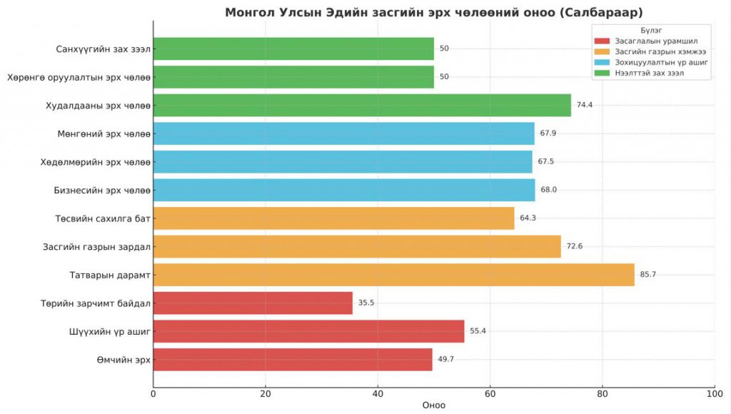 • Мөнгөний бодлогын чөлөөт байдал – Мөнгөний бодлогын үр дүнтэй байдал болон дотоодын инфляцын байдлыг дүгнэн үнэлдэг.