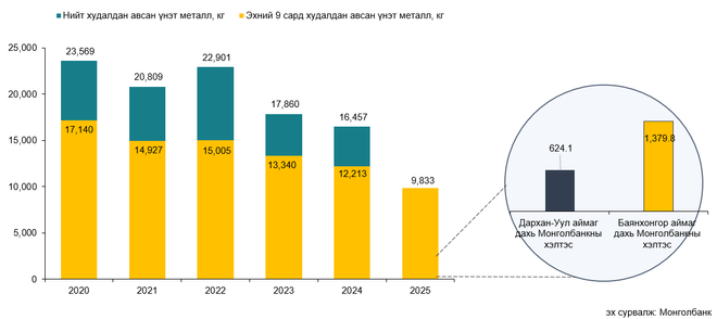 Монголбанк 2025 оны есдүгээр сард 2,094.7 кг үнэт металл худалдан авч, оны эхнээс өссөн дүнгээр 9.8 тонн үнэт металл худалдан аваад байна. Энэ нь өмнөх оны мөн үетэй харьцуулбал 19.5 хувиар буурсан үзүүлэлт юм.