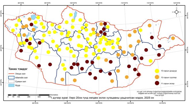 • Архангай, Орхон, Булган, Улаанбаатар, Төвийн ихэнх нутгаар 10 дугаар сарын дунд арав хоногт хөрс 20 см гүнд хөлдөх төлөвтэй байна.