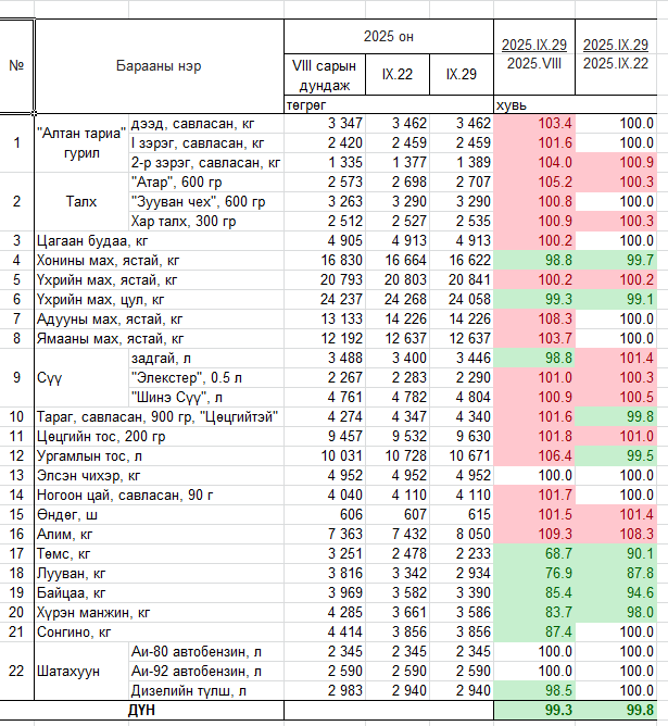 Харин хонины мах, үхрийн цул мах, савласан тараг, төмс, лууван, байцааны үнэ буурсан үзүүлэлттэй гарсан байна.