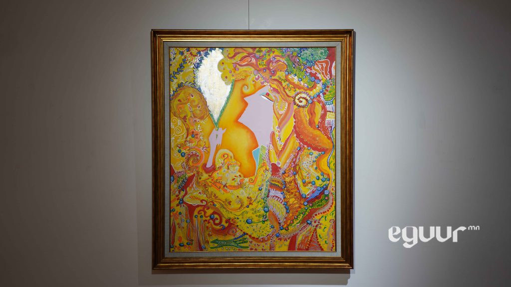 -Төв хэсэгт байрлуулсан ганц шар зураг бий. Зургийн нэр нь Зөнч. Б.Шарав гуайн Дөрвөн ойрадын уриа гэх монгол ардын хөгжмөөс сэдэвлэсэн зохиомжоос санаа авч зурсан. Дөрвөн ойрадын уриа гэдэг нь Ойрад үндэстний төрийн дуулал маягаар амнаас ам дамжин нутагшиж ардуудад үлдсэн байсан аялгуу. Түүнийг Б.Шарав гуай зохиомжлоод орчин үеийн хэллэгт оруулан бичсэн. Тэндээс сэдэвлэсэн энэ зургаа би жил гаран зурсан. Их цаг, ажил орсон бүтээл.