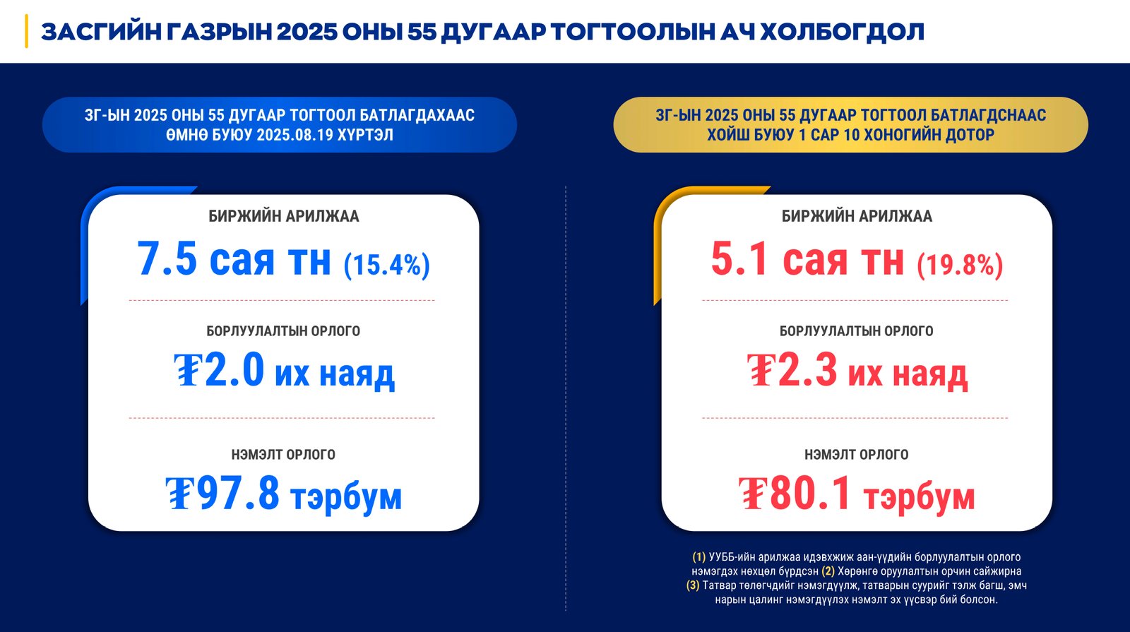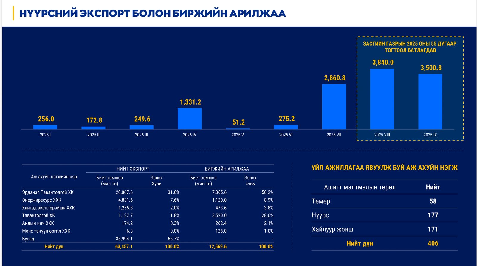 Одоо 50 хувь амны гэрээ, 50 хувь биржийн арилжааны нүүрсийг экспортлох шийдвэрийг гаргасан. Биржийн арилжаа яагаад чухал юм бэ гэхээр Улсын төсөвт шууд орлого орж ирдэг. Өнгөрсөн 9 тогтоолд янз бүрийн шийдвэр гарч байсан. Жишээ нь 100 төгрөгийн зүйлийг 50 төгрөгөөр борлуулж байсан. Мөн 100 төгрөгийн зүйлийг 120-оор тооцож аж, ахуй нэгжүүдээс нэмэгдүүлсэн татвар авч байсан.