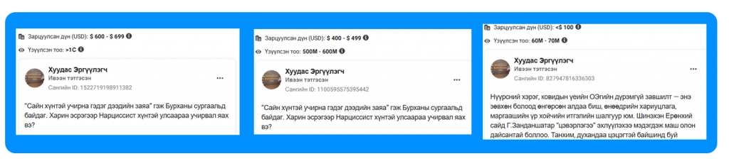 Одоогийн байдлаар дээр харагдаж буй "Б.Энхбаяр УИХ-ын дарга Д.Амарбаясгаланг ямар үндэслэл, баримтад үндэслэн олон нийтэд худал мэдээлэл цацсанаа баримтаар нотлох үүрэгтэй!”, “Б.Энхбаяр УИХ-ын дарга Д.Амарбаясгаланг ямар үндэслэл, баримтад үндэслэн олон нийтэд худал мэдээлэл цацсанаа баримтаар нотлох үүрэгтэй!” гэх мэдээллүүд тус бүр 100 долларыг төлөн идэвхтэйгээр тараагдаж байна.