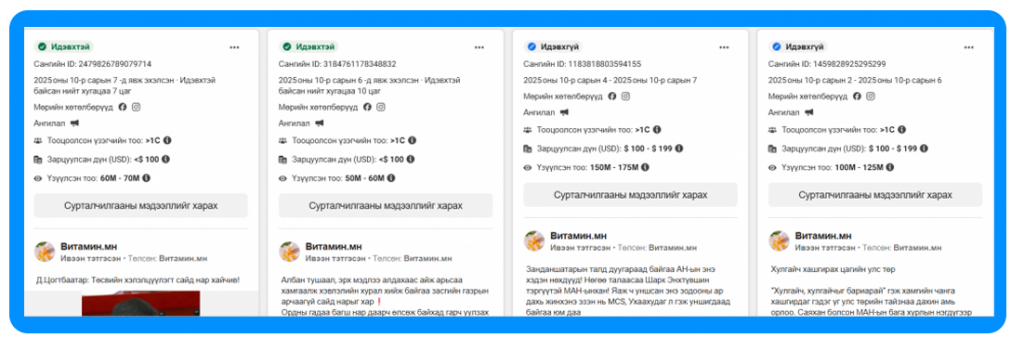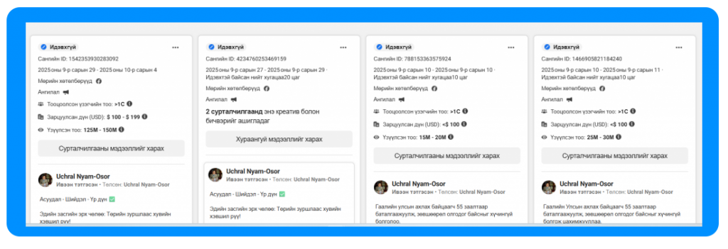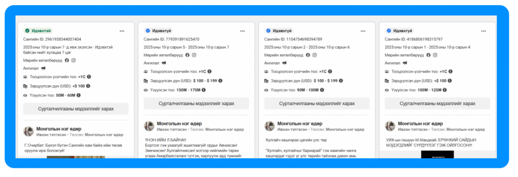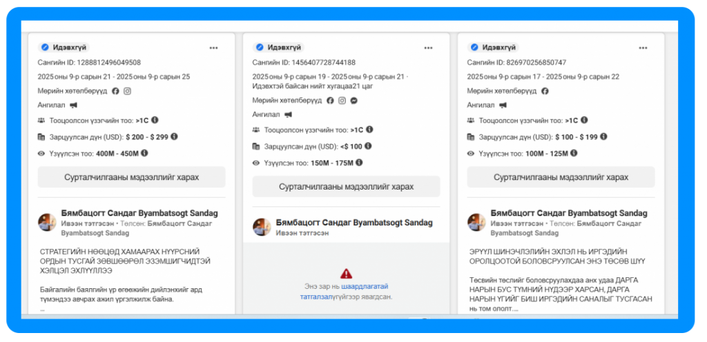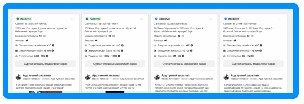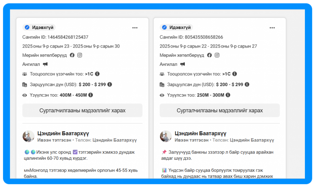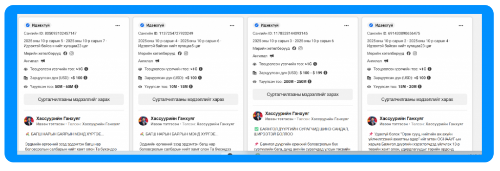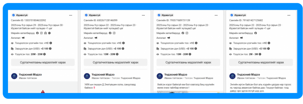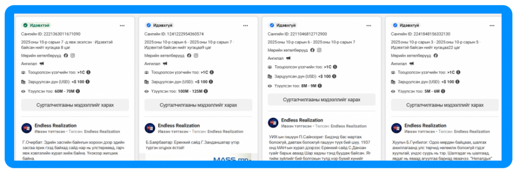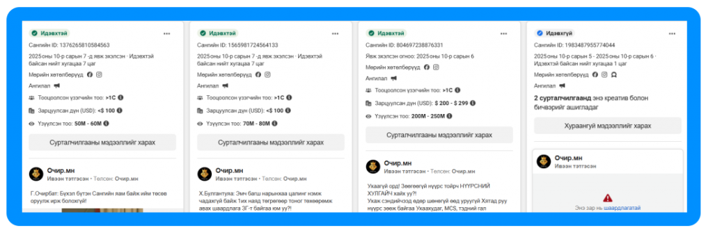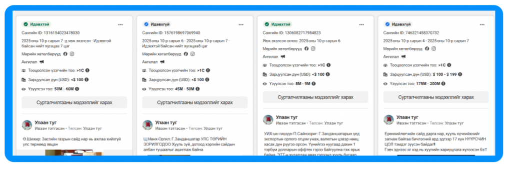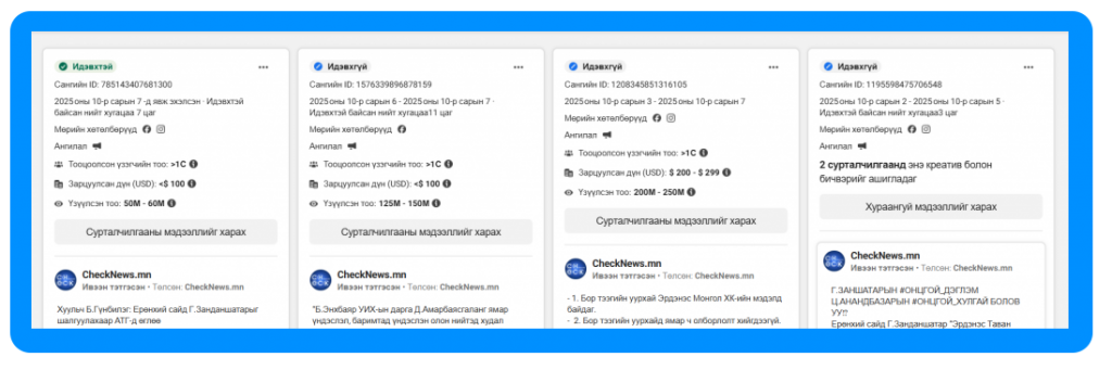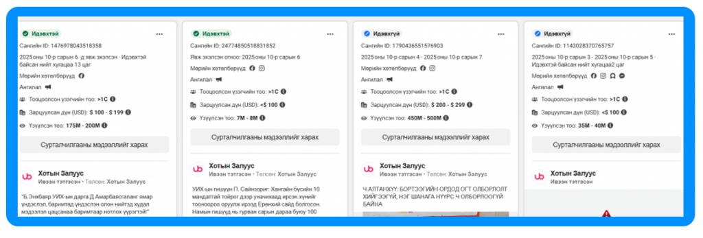 Одоогоор "Хуульч Б.Гүнбилэг: Ерөнхий сайд Г.Занданшатарыг шалгуулахаар АТГ-д өглөө" гэх гарчигтай мэдээлэл Мета-д 100 доллар төлөн идэвхтэйгээр тараагдаж байна.