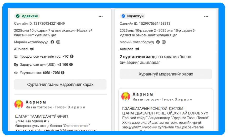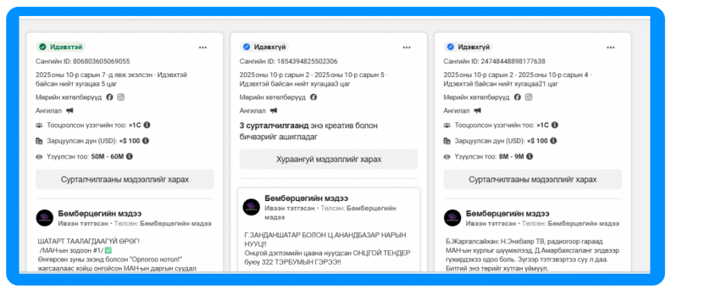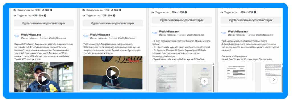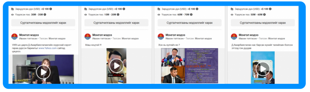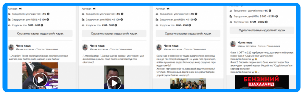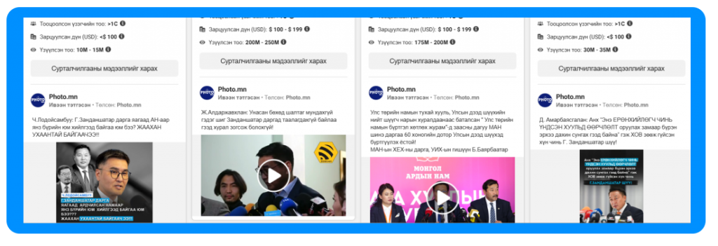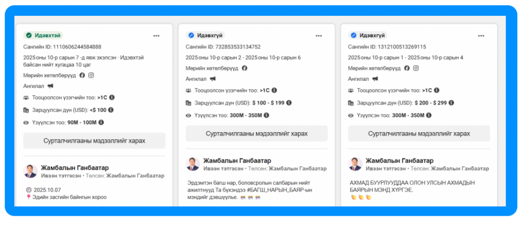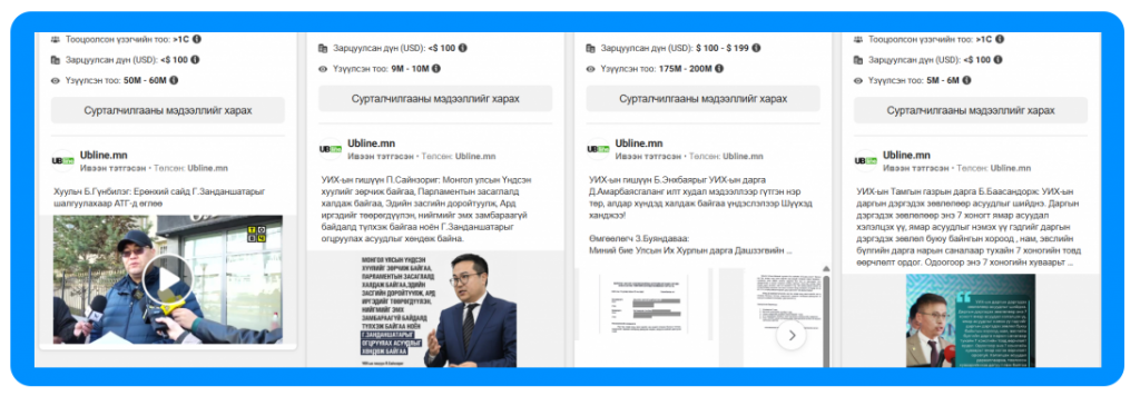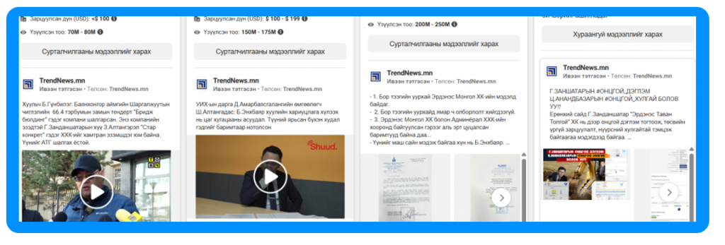 1.Хуудас эргүүлэгч: Сүүлийн нэг сарын хугацаанд Г.Занданшатарыг дэмжсэн мэдээллүүдийг түгээсэн бөгөөд энэ хугацаанд улс төрийн агуулгатай гурван мэдээллийг олонд хүргэхийн тулд нийт 1248$ зарцуулсан. Энэ нь Монгол мөнгөөр 4.5 сая төгрөгийг Meta-д төлсөн гэсэн үг.