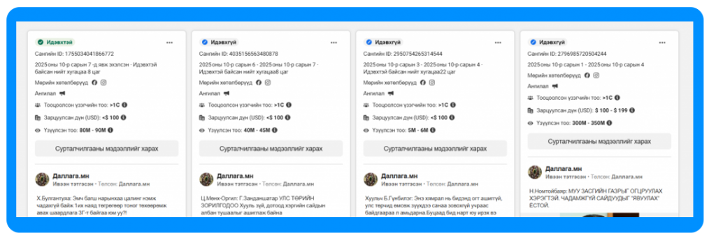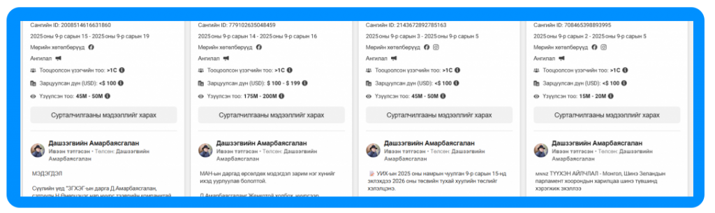 Бид дээрх дата судалгаандаа хамгийн өндөр өртөг зарцуулан мэдээлэл тараасан 20 пэйж хуудсыг л хамруулав. Ингэхэд Г.Занданшатарыг дэмжсэн агуулгатай 34 мэдээлэл хоёр пэйж хуудсаар тараагдахдаа 8.4 сая төгрөгийг, Д.Амарбаясгаланг дэмжсэн 142 мэдээлэл 18 пэйж хуудсаар тараагдахдаа 42 сая төгрөгийг Meta-д төлсөн болж таарлаа. Гэхдээ дээрх мэдээллүүд дурдагдсан 20 пэйж хуудаст хязгаарлагдахгүй болов уу. Цаана хэчнээн арми, ямар өртгөөр, хэрхэн ажиллаж буйг таашгүй.