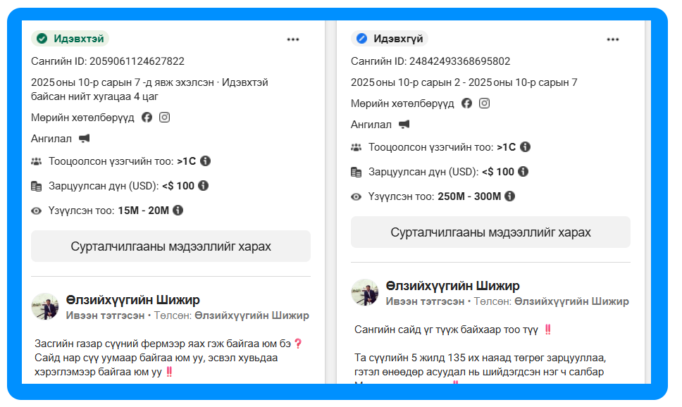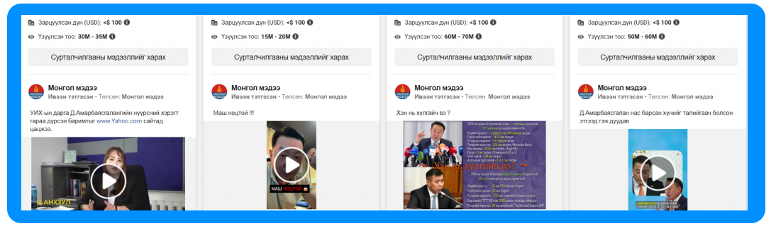 Бид дээрх дата суд�##�гаандаа хамгийн өндөр өртөг зарцуулан мэдээлэл тараасан 20 пэйж хуудсыг л хамруулав. Ингэхэд Г.Занданшатарыг дэмжсэн агуулгатай 34 мэдээлэл хоёр пэйж хуудсаар тараагдахдаа 8.4 сая төгрөгийг, Д.Амарбаясг�##�анг дэмжсэн 142 мэдээлэл 18 пэйж хуудсаар тараагдахдаа 42 сая төгрөгийг Meta-д төлсөн болж таарлаа. Гэхдээ дээрх мэдээллүүд дурдагдсан 20 пэйж хуудаст хязгаарлагдахгүй болов уу. Цаана хэчнээн арми, ямар өртгөөр, хэрхэн ажиллаж буйг таашгүй.