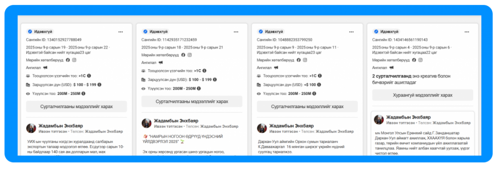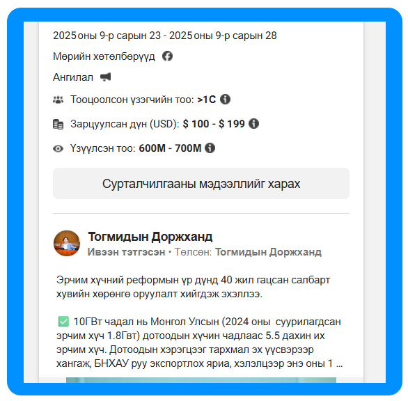 Хүнс, хөдөө аж ахуй, хөнгөн үйлдвэрийн сайд Ж.Энхбаяр нэг сарын хугацаанд 420 доллар буюу 1.5 сая төгрөгийг Meta-д төлсөн байна. Ингэхдээ дээрх өртгөөр таван мэдээллийг 200-250 хүртэлх долларыг төлж өөрийн цахим хуудсаараа түгээжээ.