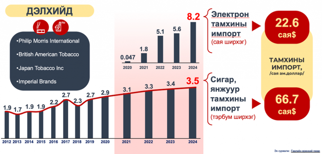 Электрон тамхины импортын дүн 2020 онд 1,160 ам.доллар байсан бол 2021 онд 6,686,926 ам.доллар, 2024 онд 21,241,872 ам.долларт хүрсэн байна. 2021 оноос өмнө электрон тамхи нийт тамхины импортын маш бага хувийг эзэлж байсан бол 2024 он гэхэд энэ үзүүлэлт 23 орчим хувьд хүрчээ.