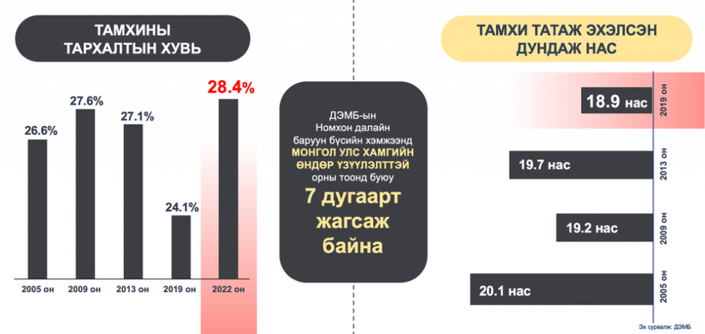 Судалгаанаас үзвэл 2013 оноос буурч байсан тамхидалтын түвшин 2020 оноос өсөж, хамгийн сүүлд 2022 онд хийсэн судалгаагаар 28.4%-д хүрч, тамхи татаж эхэлсэн дундаж нас 18.9 бол залуужжээ.