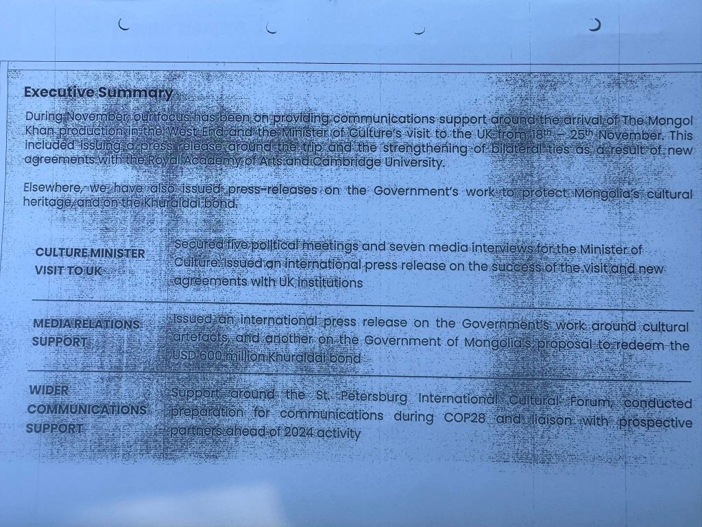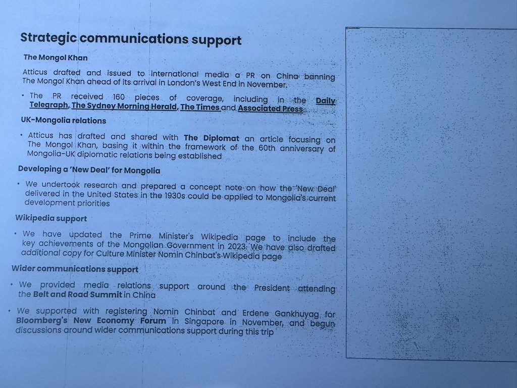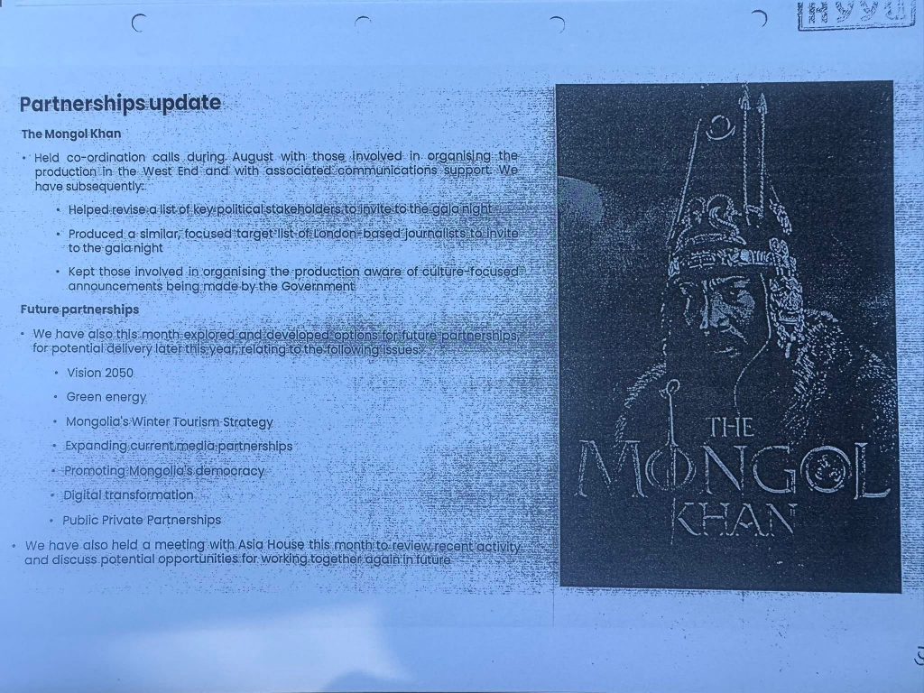Тодруулбал, “Хэро энтертайнмент” “Монгол хаан“ жүжиг болон гадаад сурталчилгааг хийлгэхээр гадны PR компанитай хийсэн гэрээгээ нууцад авсан. Үүний санхүүжилт болох 7 тэрбум төгрөгийг “Эрдэнэс Оюутолгой“ компаниас гаргасан” тухай дэлгээд буй юм.