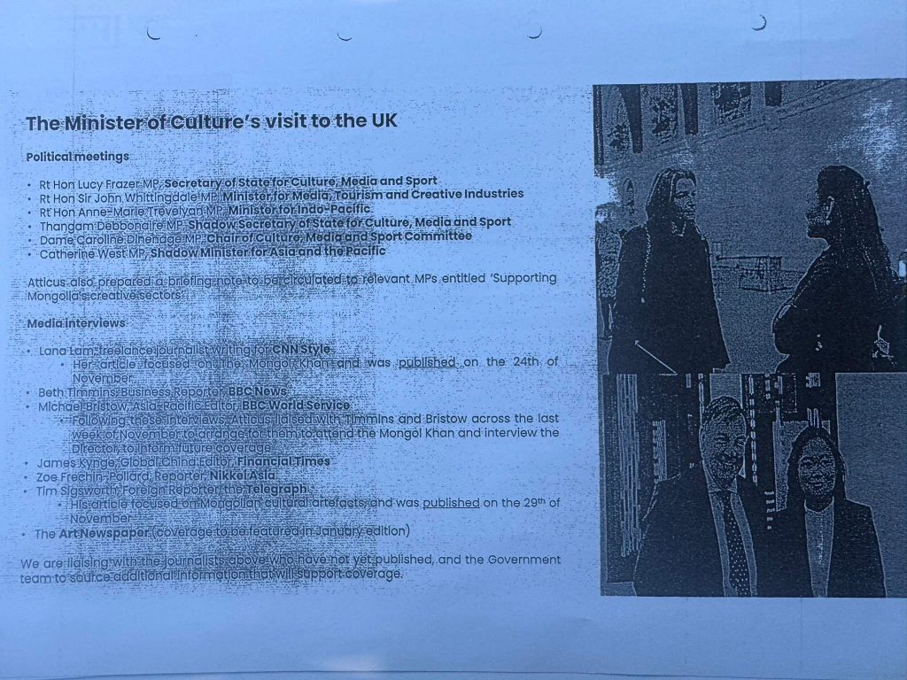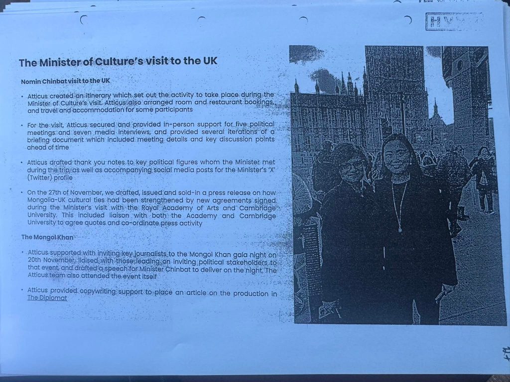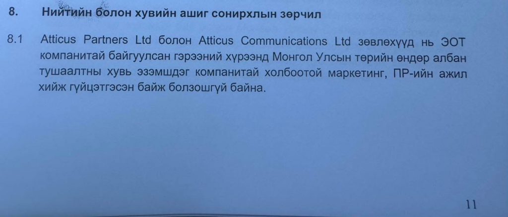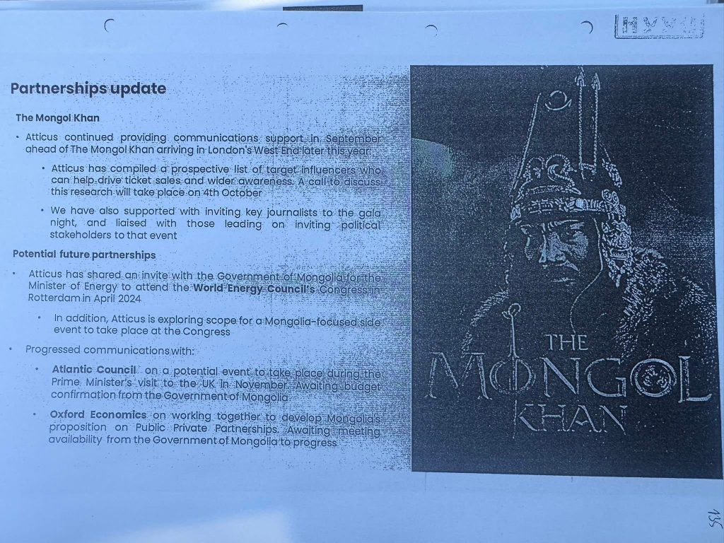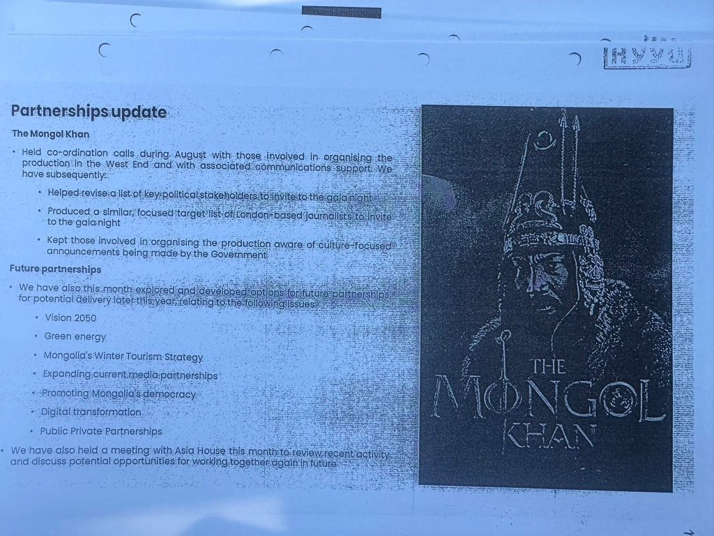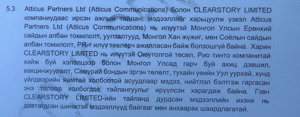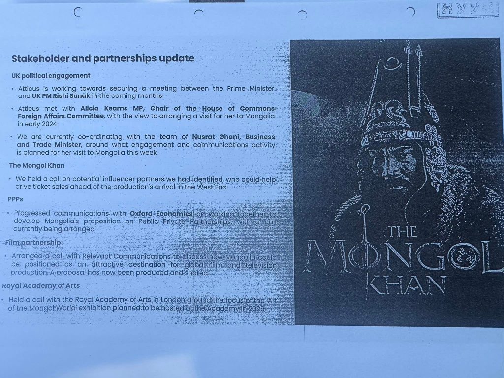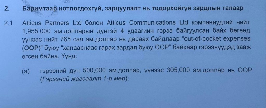 “Эрдэнэс Оюутолгой” компани нь Л.Оюун-Эрдэнийн Засгийн газрын шийдвэрийн дагуу гадаадын “Atticus Partners” Ltd болон “Atticus communications” Ltd компанитай дөрвөн удаагийн үйлдлээр нийт 1.9 сая ам.долларын (7 орчим тэрбум төгрөг) гэрээ хийсэн гэжээ. Энэ мөнгөөр "Хэро энтертайнмент" компанийн бүтээл “Монгол хаан” жүжгийн гадаад сурталчилгааг хийж, гэрээгээ тагнуулын байгууллагын шийдвэрээр нууцад авсан гэгдэж байна.