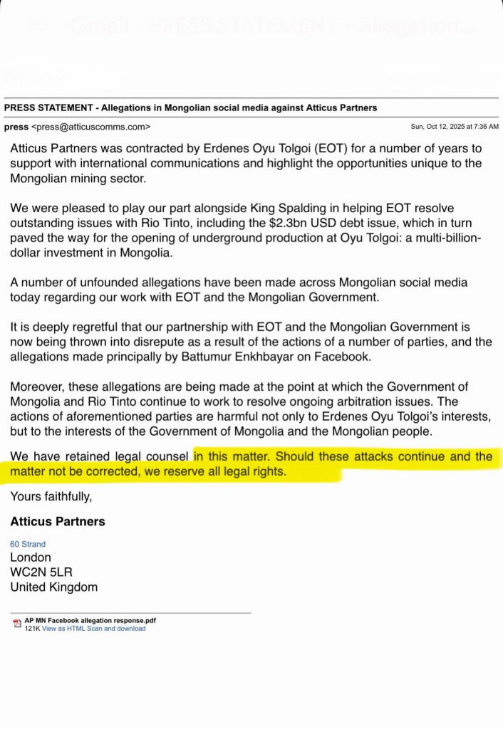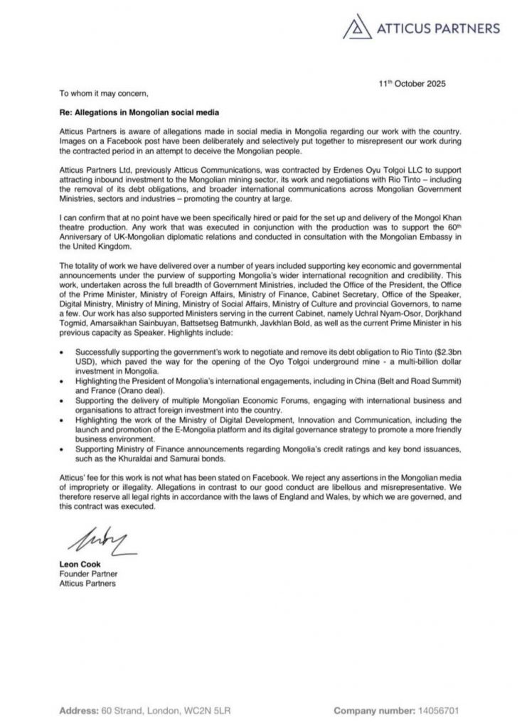 Тэгвэл өчигдөр /2025.10.11/ “Монгол хаан” жүжигтэй холбоотойгоор “Atticus Partners” компани албан ёсны тайлбар, няцаалт гаргажээ.