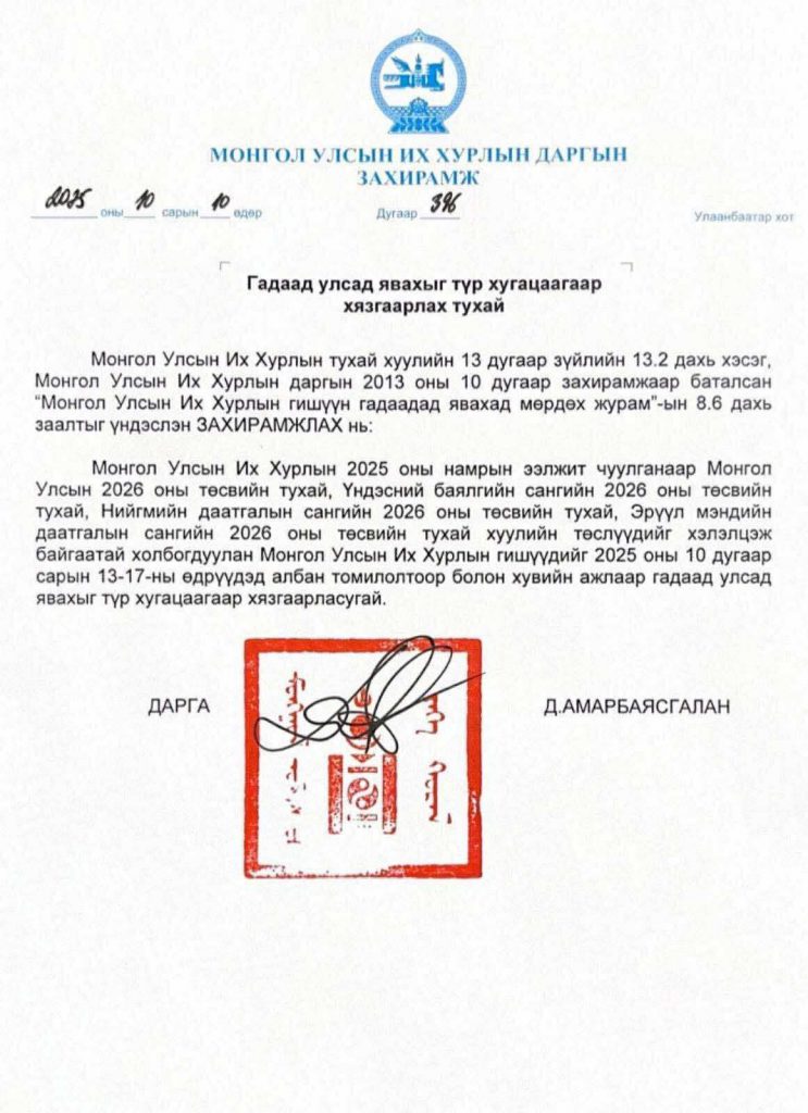 УИХ-ын дарга Д.Амарбаясгалан энэ сарын 13-17 ны өдрүүдэд гишүүдийг албан томилолтоор болон хувийн ажлаар гадаад улсад явахыг түр хугацаагаар хязгаарлалаа.