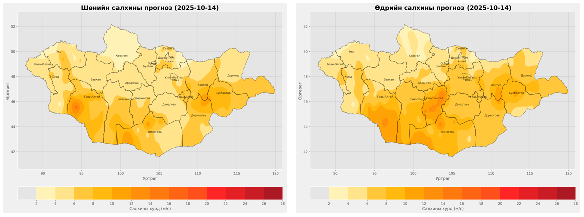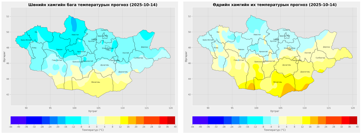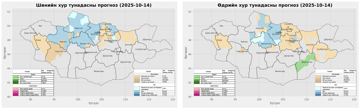 2025 оны 10-р сарын 13-ны 20 цагаас 2025 оны 10-р сарын 14-ний 20 цаг хүртэлх цаг агаарын урьдчилсан мэдээ: