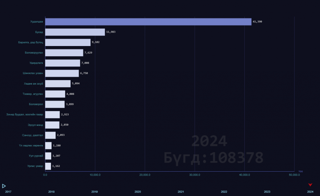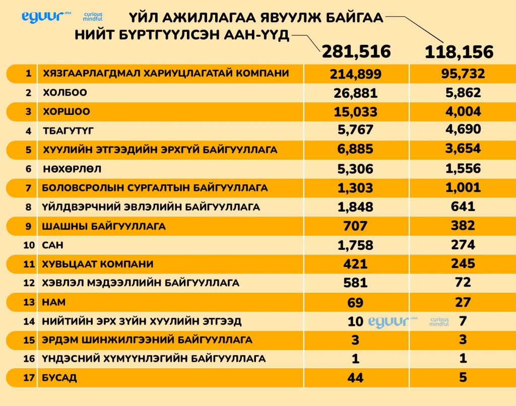 Хамгийн их нь буюу 41 мянга нь худалдааны салбарынх байна. Түүний дараа бусад салбарынх 11 мянга, барилга дэд бүтцийнх 9 мянга, борлуулалтынх 7,6 мянга байгаа гэжээ.