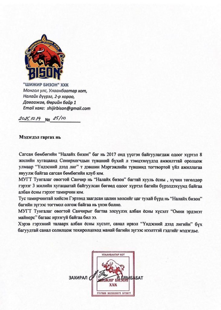 Тус мэдэгдэлдээ Т.Санчир нь Налайх Бизон багтай гурван жилийн гэрээ байгуулсан хүчин төгөлдөр үйлчилж байгаа бөгөөд гэрээнд заасан цалин хөлсийг цаг тухайд нь олгож байгаа хэмээн мэдэгдсэн байна.
