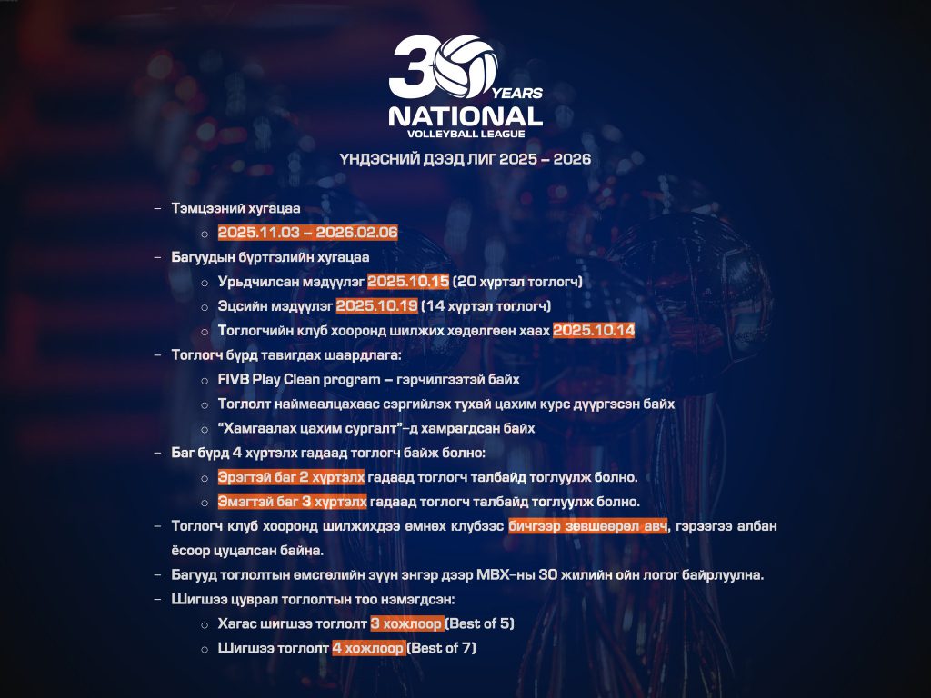 Монголын волейболын холбооны “Үндэсний дээд лиг”-ийн 30 дахь улирал ирэх сарын 03-наас 2026 оны хоёрдугаар сарын 06-ны хооронд зохион байгуулагдах гэж байна. Анх 1995 онд МВХ-ны дэд ерөнхийлөгчөөр О.Одбаяр ажиллаж байхдаа дээд лигийн тэмцээнийг санаачлан, зохион байгуулж байсан түүхтэй. Тэгвэл энэ жил волейболын холбооноос 30 дахь улирлаа ойн баримтад нэвтрүүлэгтэйгээр угтахаар төлөвлөж байгаа ажээ.