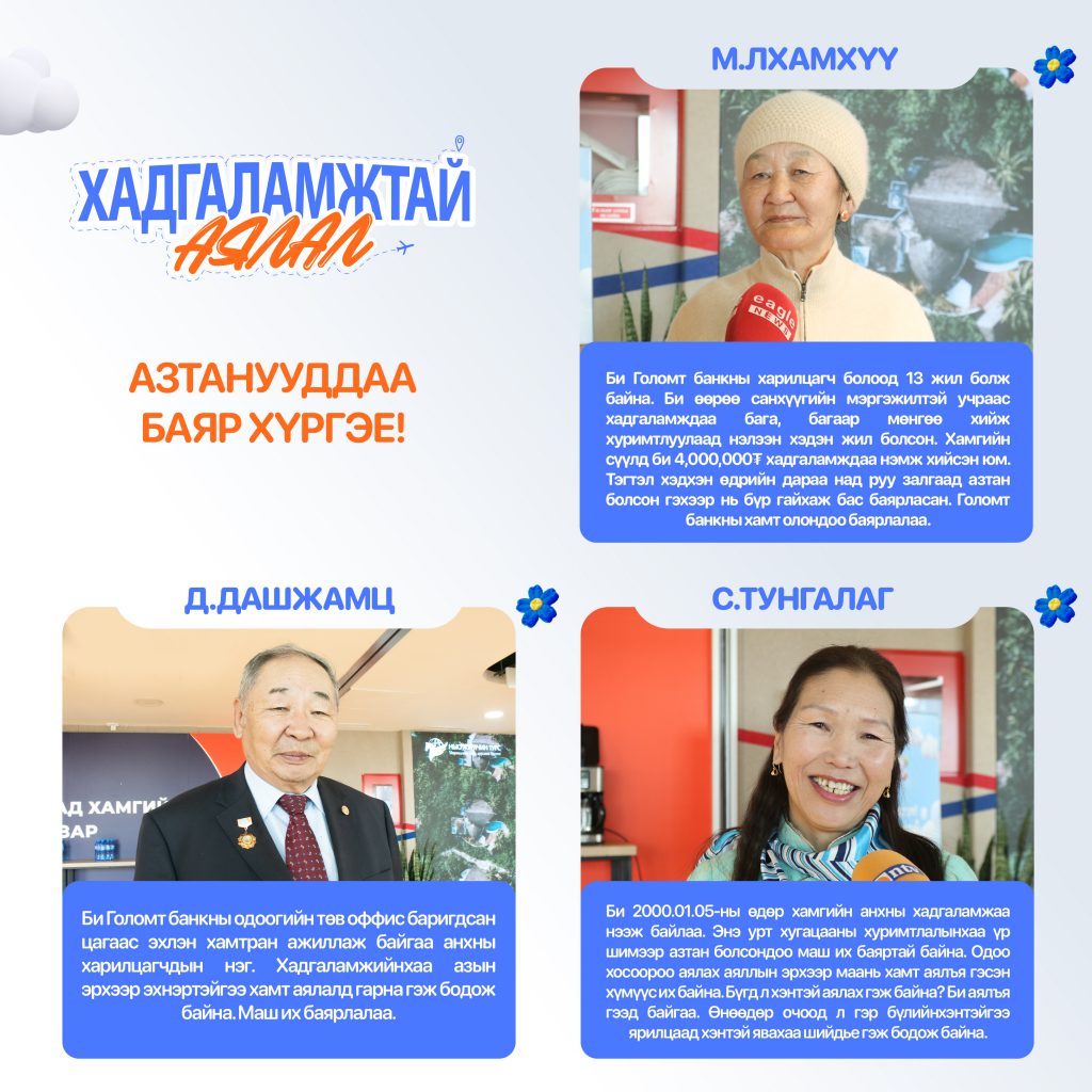 Голомт банк харилцагчдынхаа хуримтлуулах зуршлыг дэмжих зорилгоор “Хадгаламжтай аялал” аяныг 2 дахь жилдээ амжилттай хэрэгжүүлж байна. Аяны хүрээнд 2025 онд нийт 30 азтаныг хосоор нь БНСУ /Жэжү/, Тайланд, Вьетнам зэрэг орнуудаар аялах аяллын эрхээр урамшуулахаар төлөвлөөд байгаа юм. Харилцагчид аянд оролцохын тулд 6 сараас дээш хугацаатай хадгаламждаа, 100,000₮-өөс дээш дүнгээр орлого хийсэн эсвэл шинээр хадгаламж нээсэн байх шаардлагатай. Харин аяны нөхцөлийг биелүүлсэн тохиолдолд автоматаар сугалаа үүсэх болно.