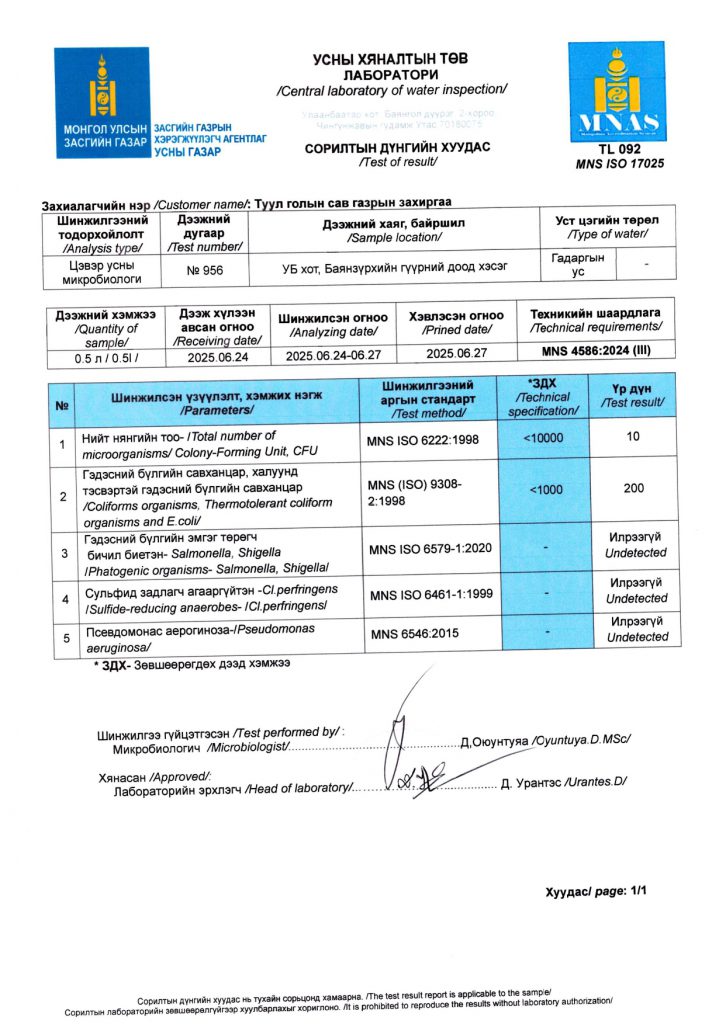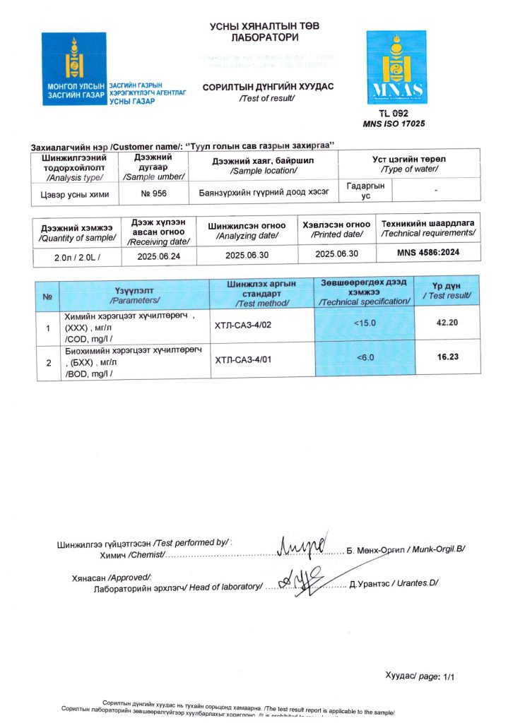 Тус №956, 957, 958, 959 тоот сорилтын дугаартай дээжүүдэд хими, нян судлалын шинжилгээний шинжлэгдсэн үзүүлэлтүүдийн дүнгээр Баянзүрхийн гүүр орчимд химийн хэрэгцээт хүчилтөрөгчийн үзүүлэлт стандартын шалгуураас 2,8 дахин их гарчээ. Мөн биохимийн хэрэгцээт хүчилтөрөгч нь 2,6 дахин их гарсан нь “Усан орчны чанарын үзүүлэлт MNS 4586:2024” стандартын шаардлага хангахгүй байна гэсэн хариу гарсан байна. Иймд иргэдийг Туул голын уснаас анхаарал болгоомжтой хэрэглэхийг анхаарууллаа.