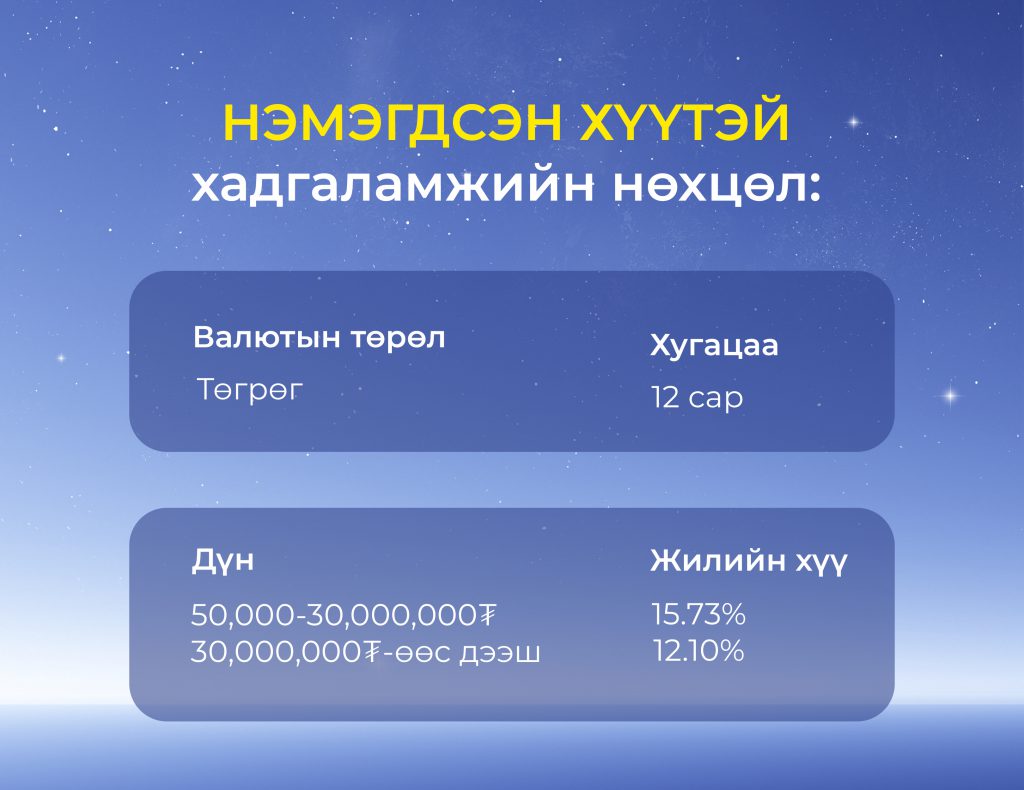 Урамшууллын хугацаа дуусахаас өмнө амжиж хадгаламжаа нээгээд 30% нэмэгдэлтэй дүнгээр буюу жилийн 15.73%-ийн хүүгээр хадгаламжтай болоорой.
