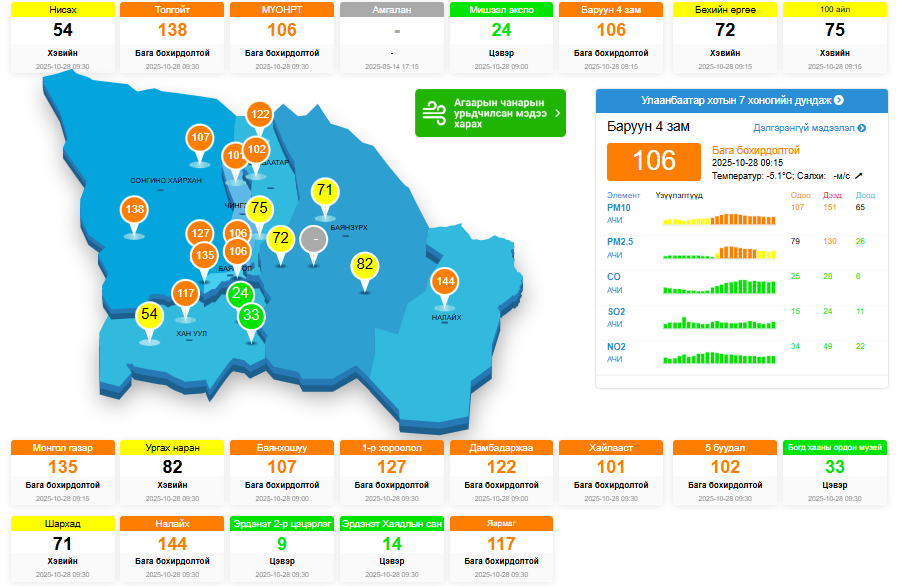 Нийслэлийн агаарын чанарын /2025-10-28/-ны өдрийн 09.30 цагийн байдлаарх агаарын чанарын мэдээллийг хүргэж байна.