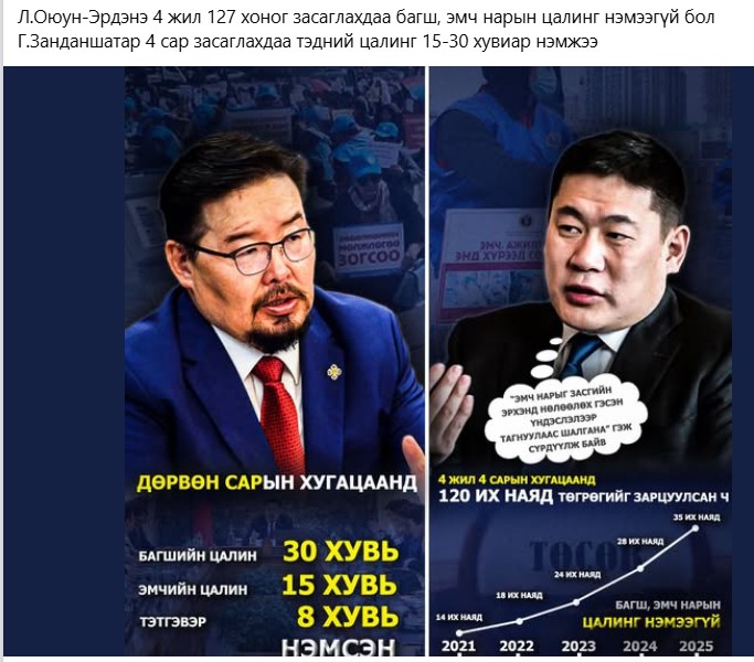 Үүнтэй холбоотойгоор цахим орчинд өчигдрөөс, "Л.Оюун-Эрдэнэ 4 жил 127 хоног засаглахдаа багш, эмч нарын цалинг нэмээгүй бол Г.Занданшатар 4 сар засаглахдаа тэдний цалинг 15-30 хувиар нэмжээ" хэмээх мэдээлэл хөвөрсөн юм.