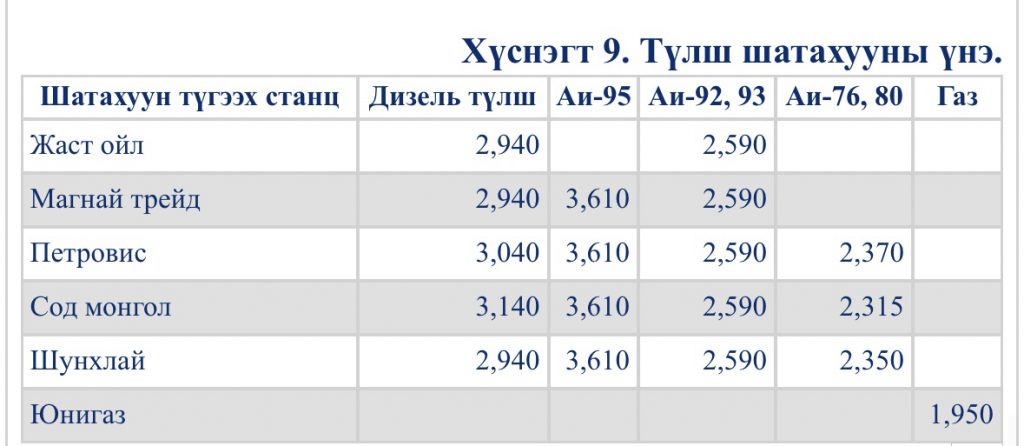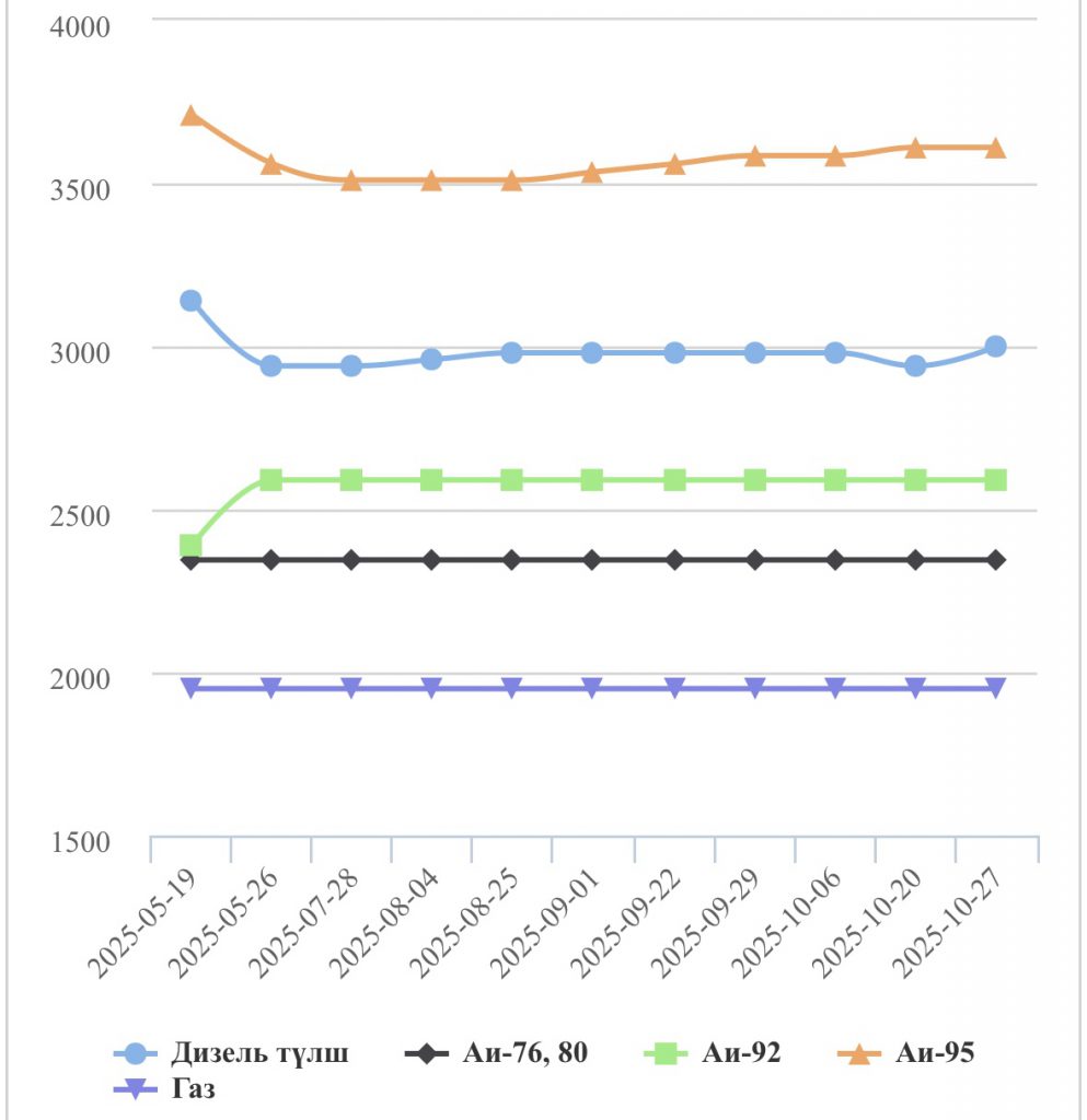 АИ-92. Автобензиний үнэ 2025 оны V сараас нэмэгдсэн. 2025.05.19-ний өдөр хүртэл 2,390 төгрөгийн үнэтэй байсан. Тэд өдрөөс хойш жижиглэнгийн үнэ литр тутамдаа 200 төгрөгөөр нэмэгдэж 2590 төгрөгт хүрсэн. Түүнээс хойш тогтмол болов.